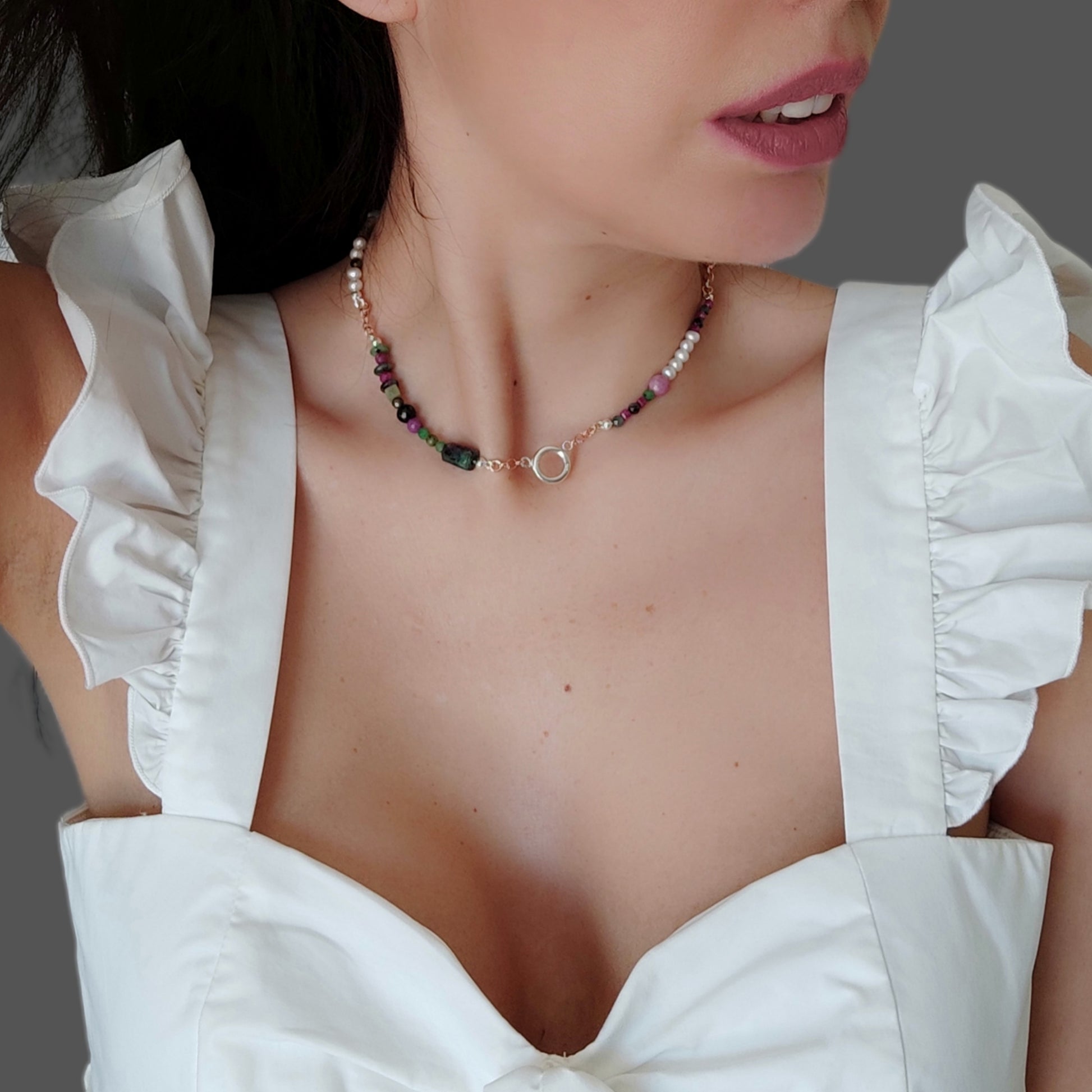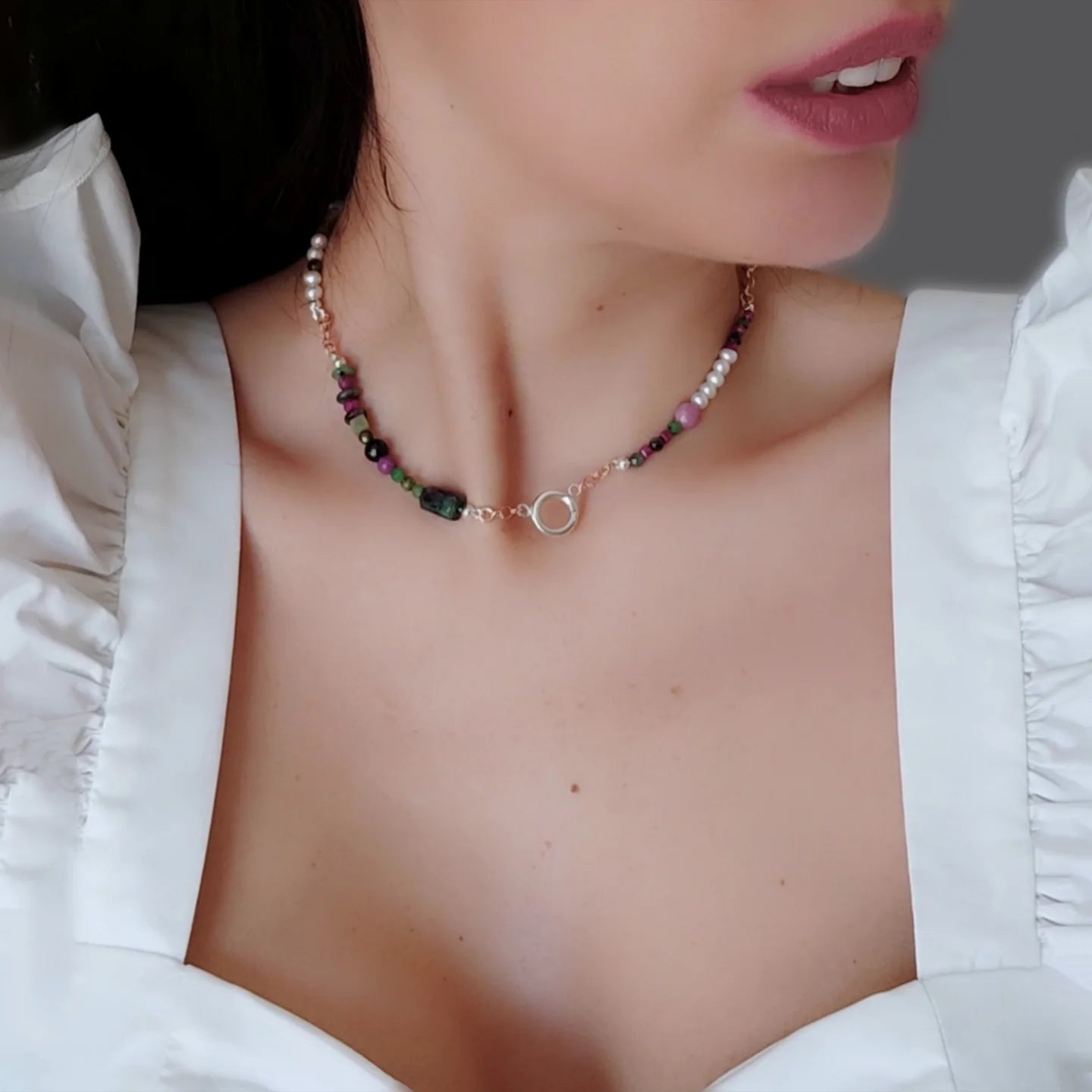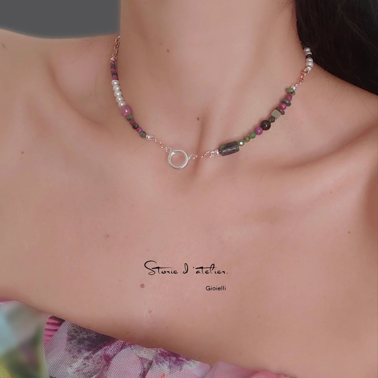 Un raffinato connubio di eleganza e artigianalità: questa collana girocollo in due pezzi è realizzata interamente a mano in argento 925 e argento placcato oro rosa 18k. La composizione esclusiva di pietre naturali dona al gioiello un carattere sofisticato e ricercato.