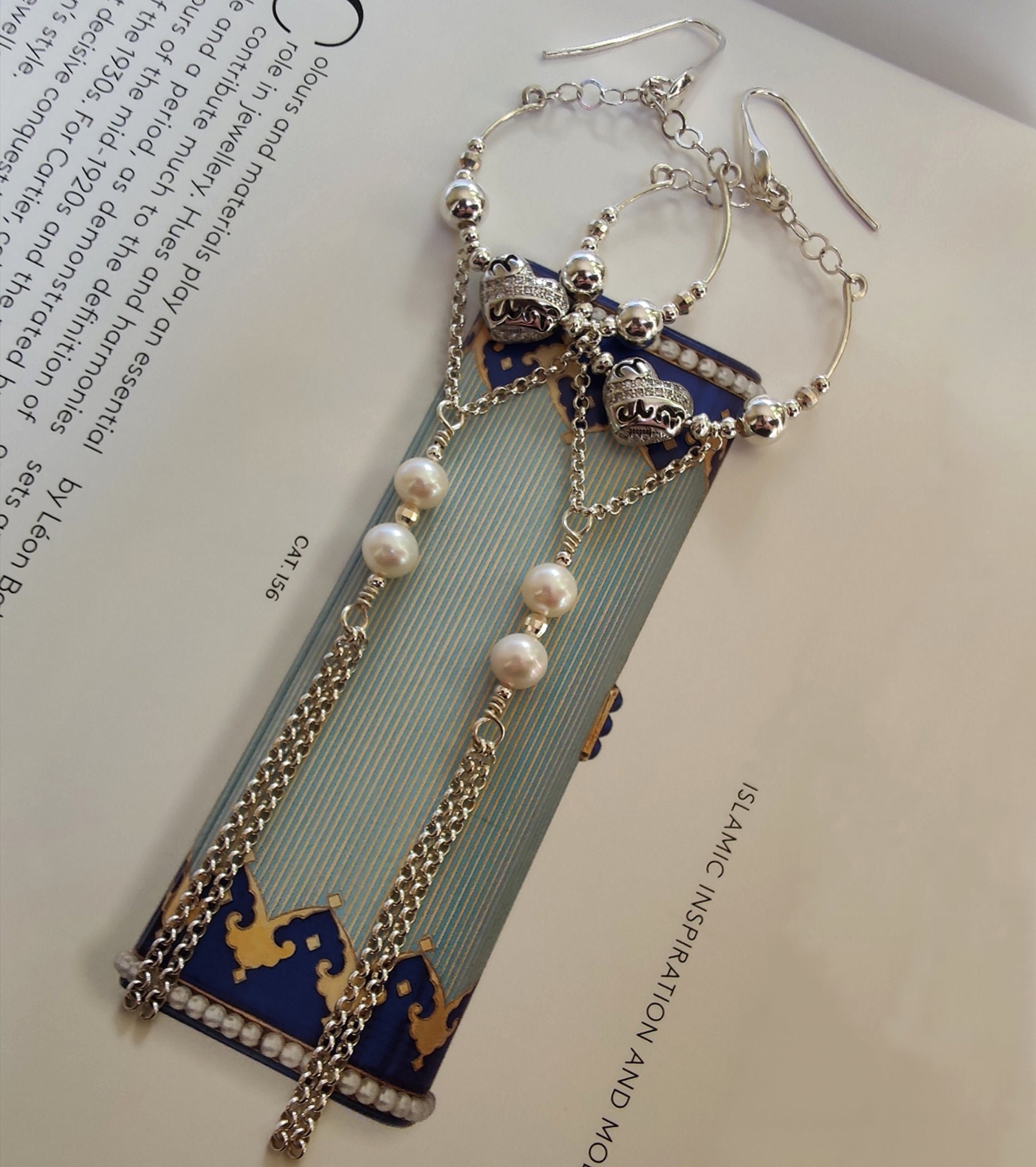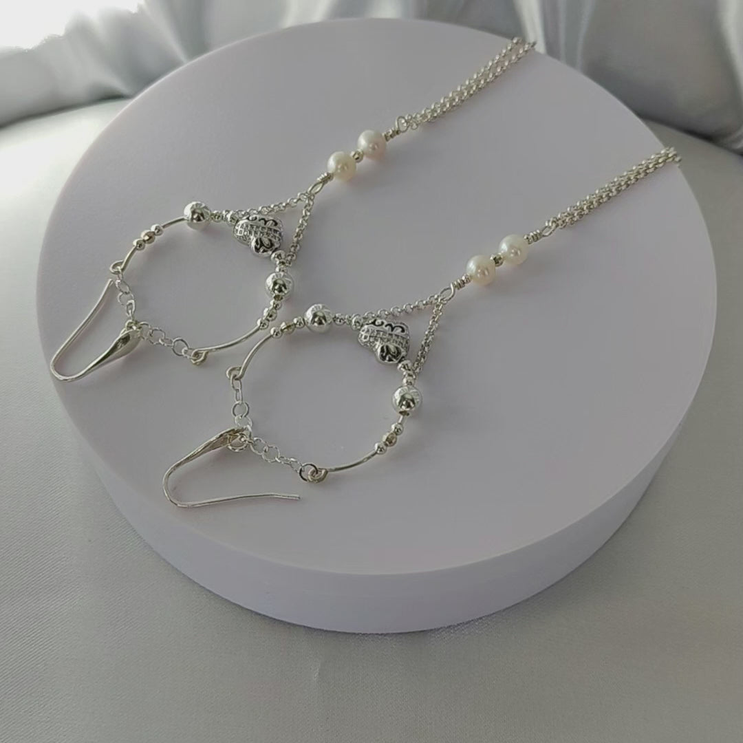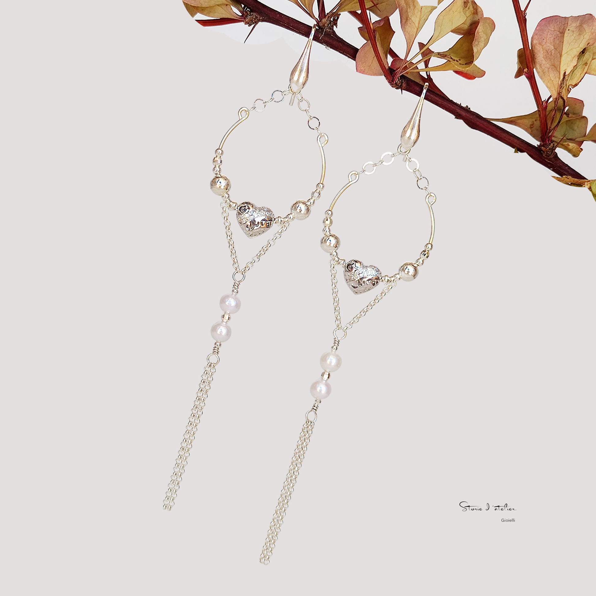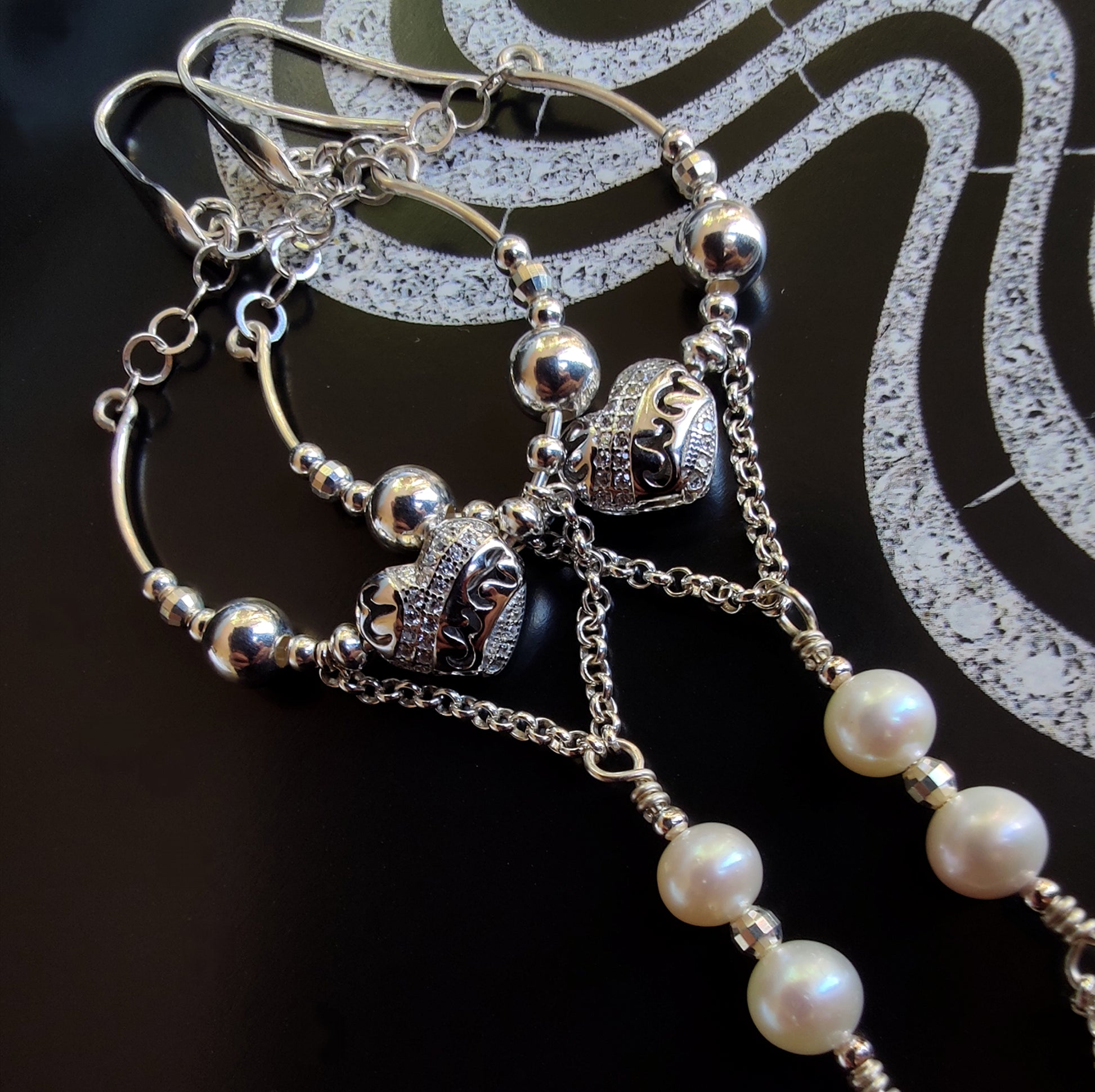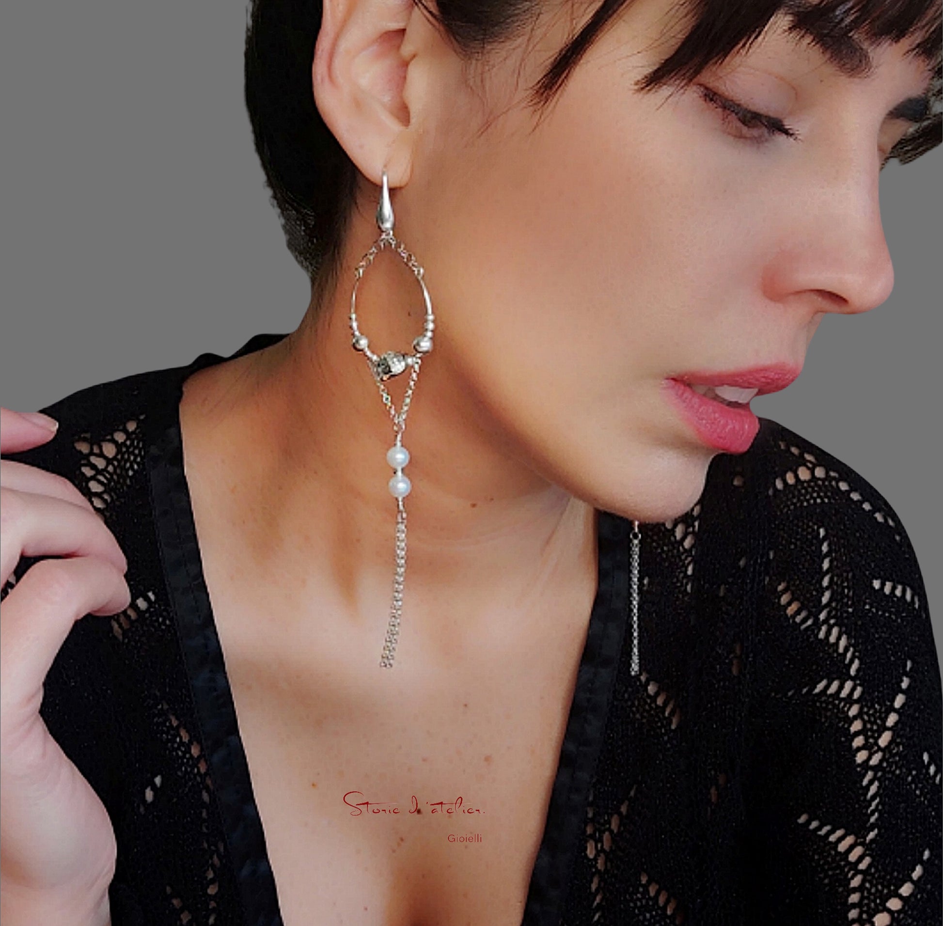 ST24 - Orecchini lunghi in argento 925 con perle naturali e zirconi.