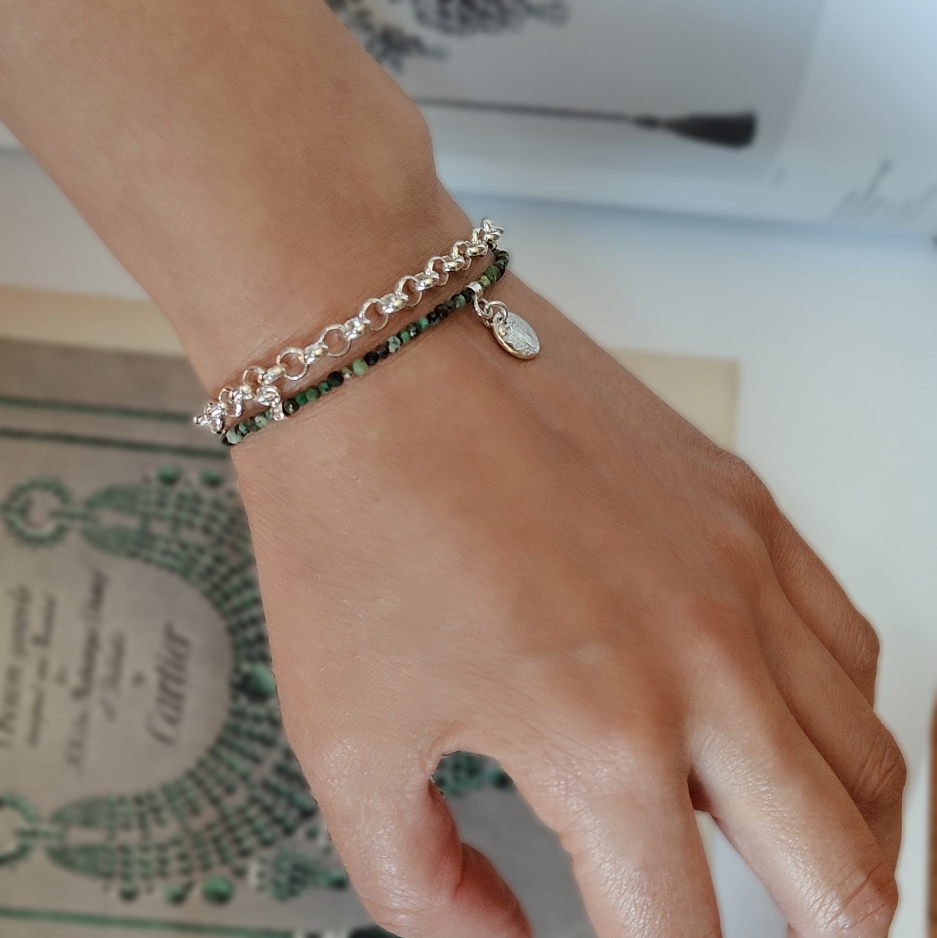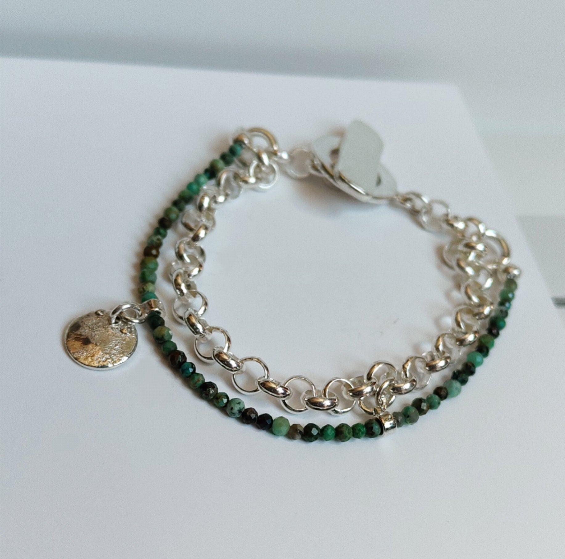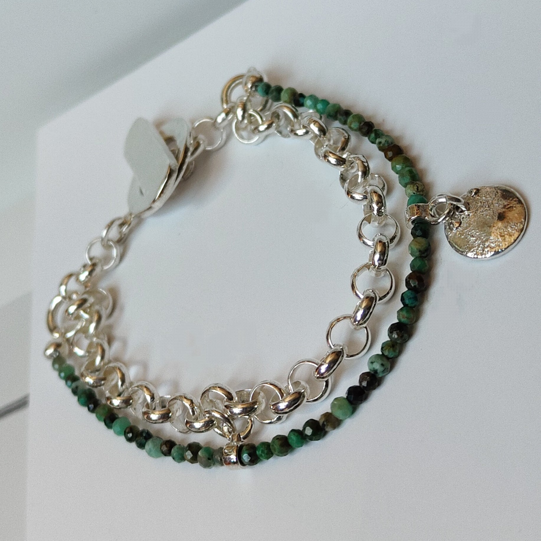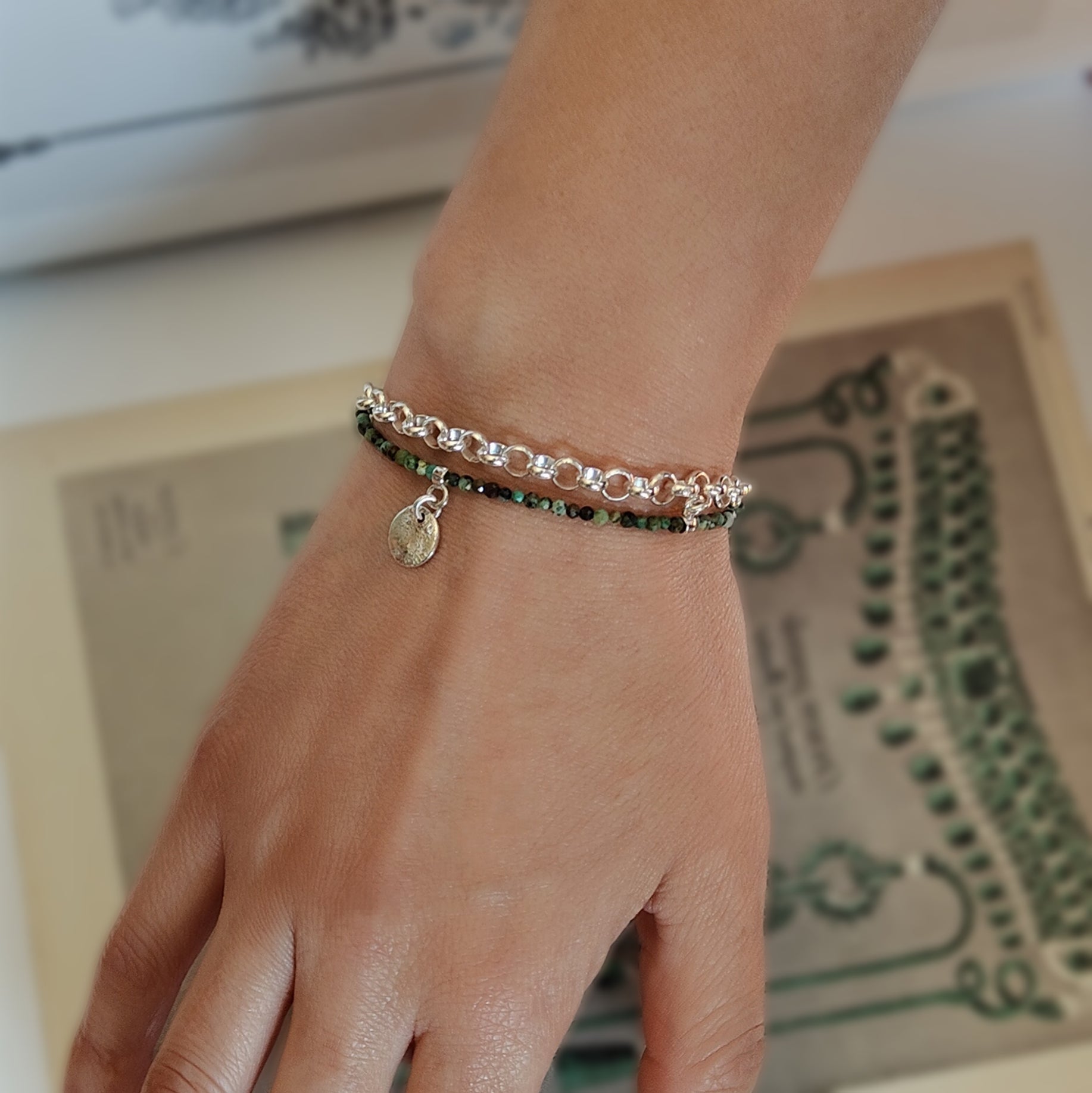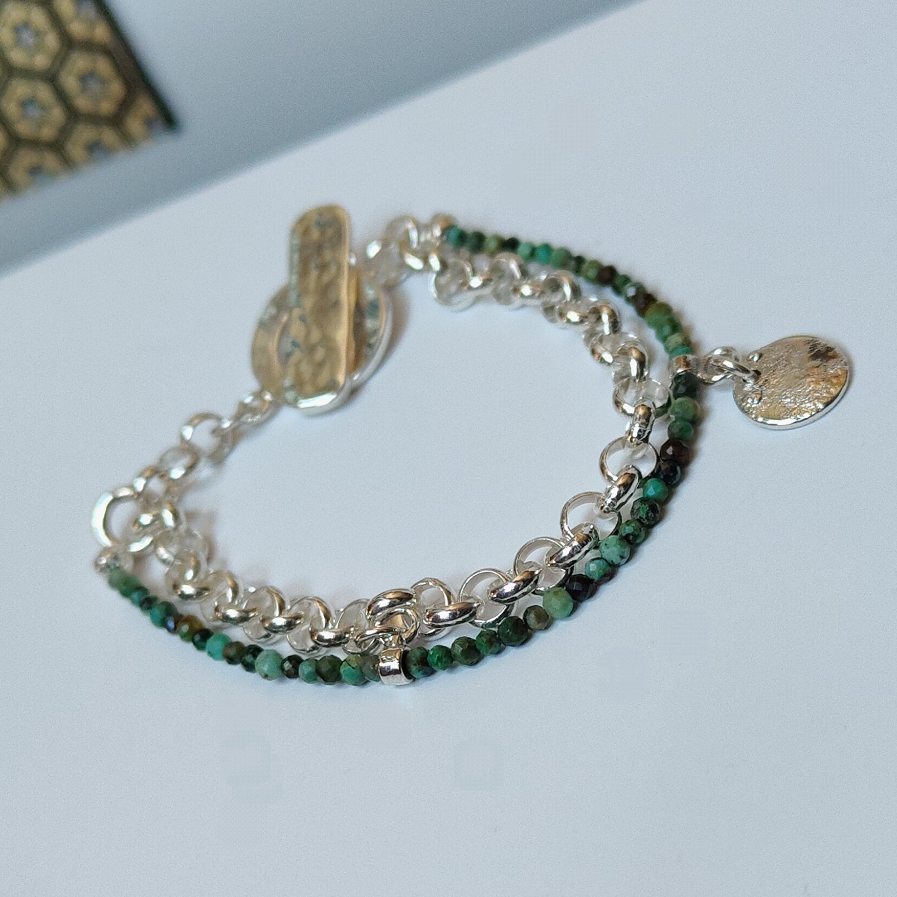 Bracciale realizzato in argento 925, impreziosito da perline di turchese africano dai toni intensi e naturali. La chiusura a T in argento martellato, aggiunge un tocco artigianale ed elegante al desing.