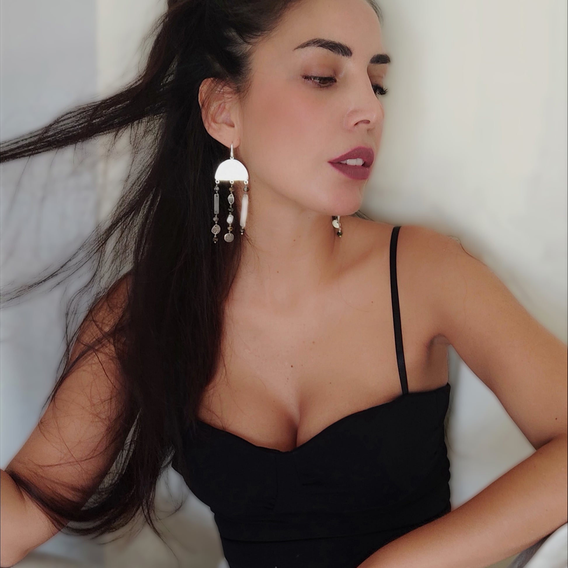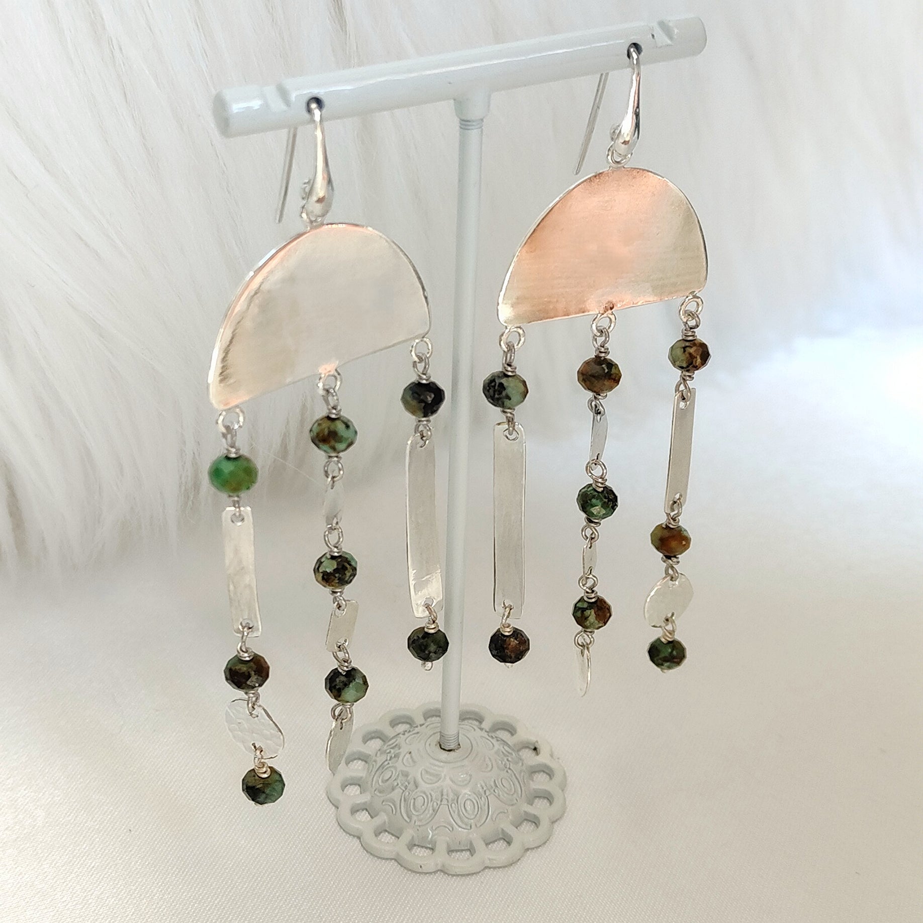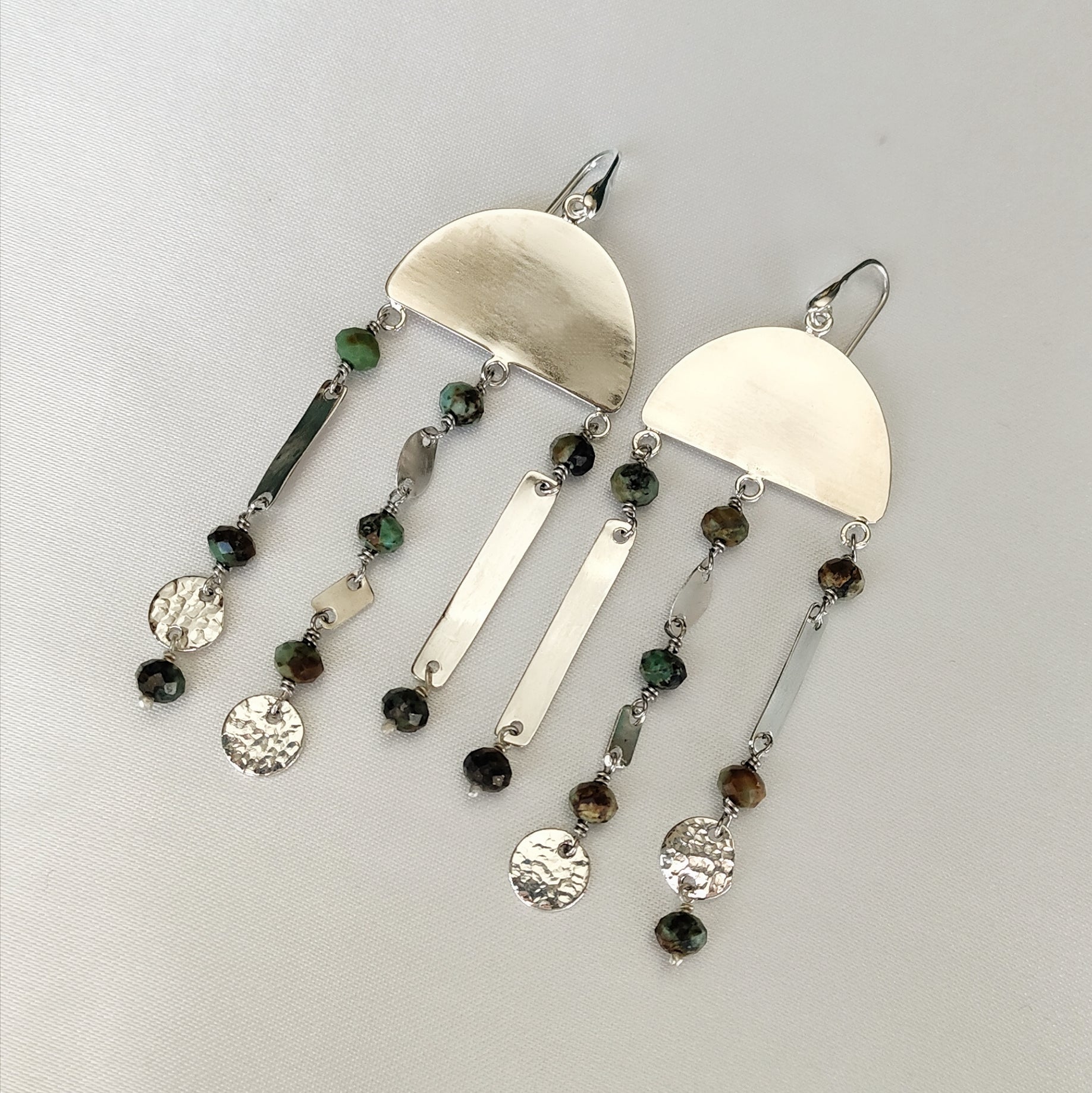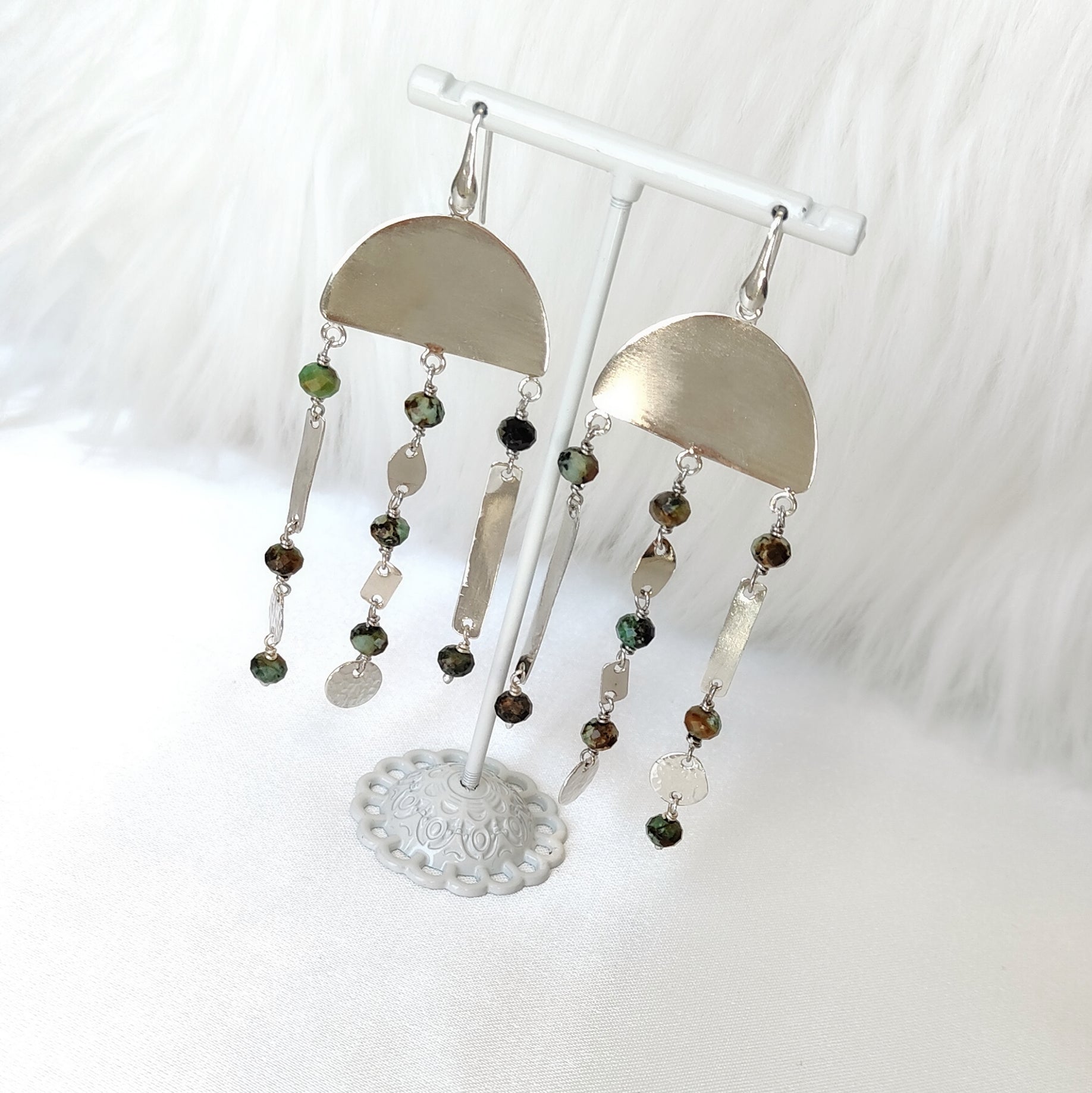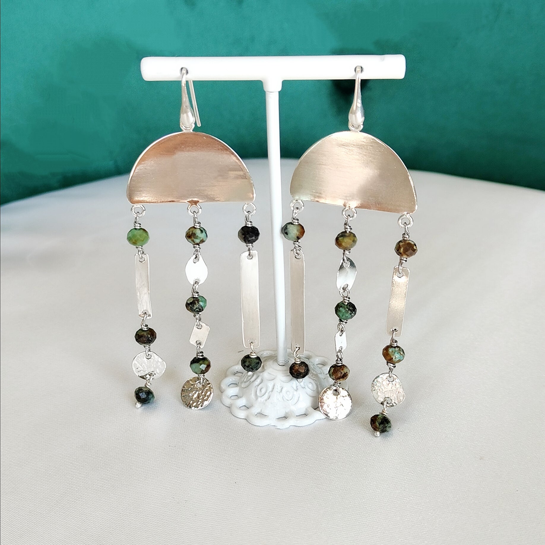 Realizzati a mano in argento 925, questi orecchini uniscono linee pulite e dettagli naturali. Le mezze lune in argento si abbinano a sottili pendenti decorati con pietre di turchese africano, dalle tonalità verdi e terrose.