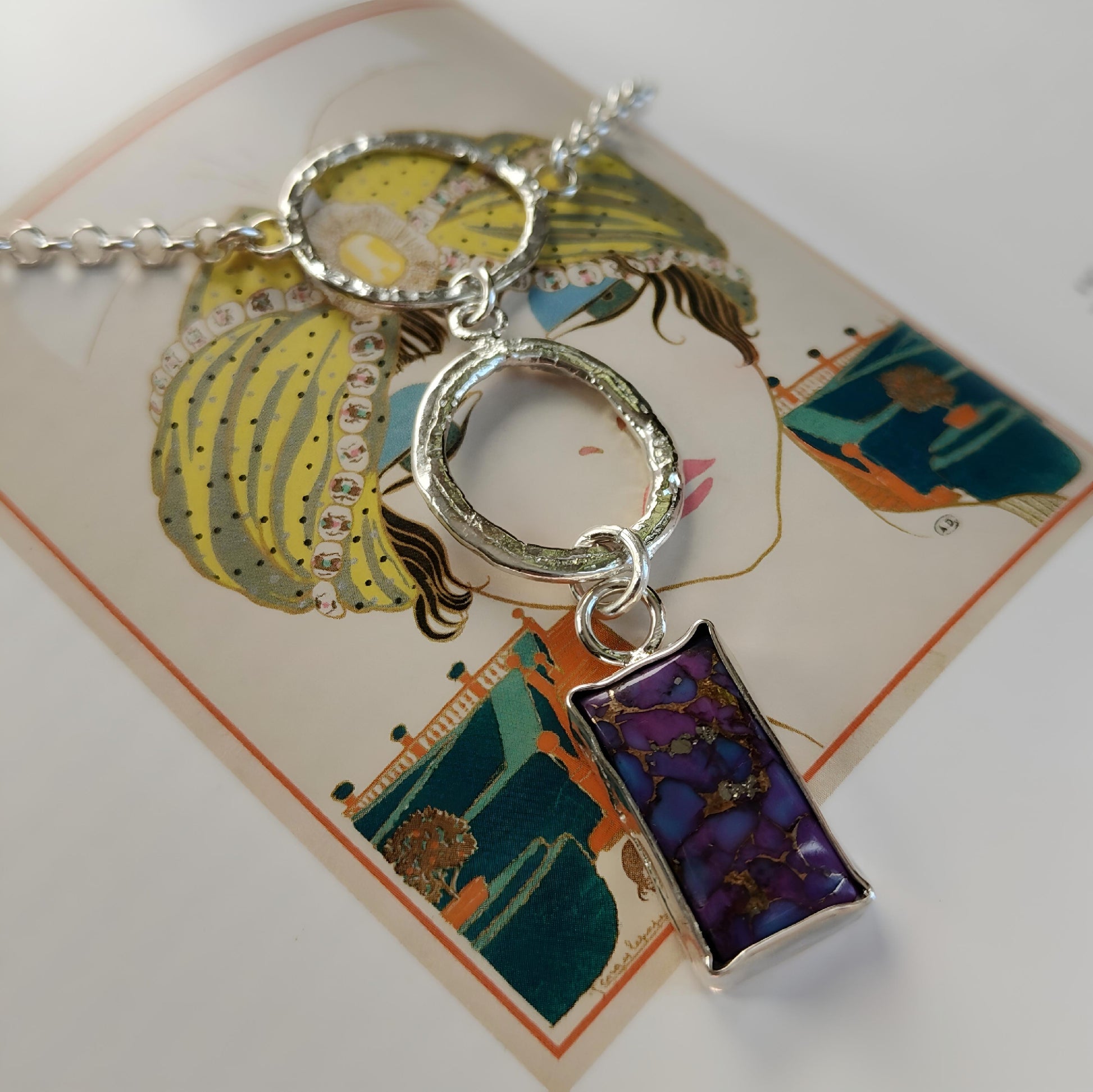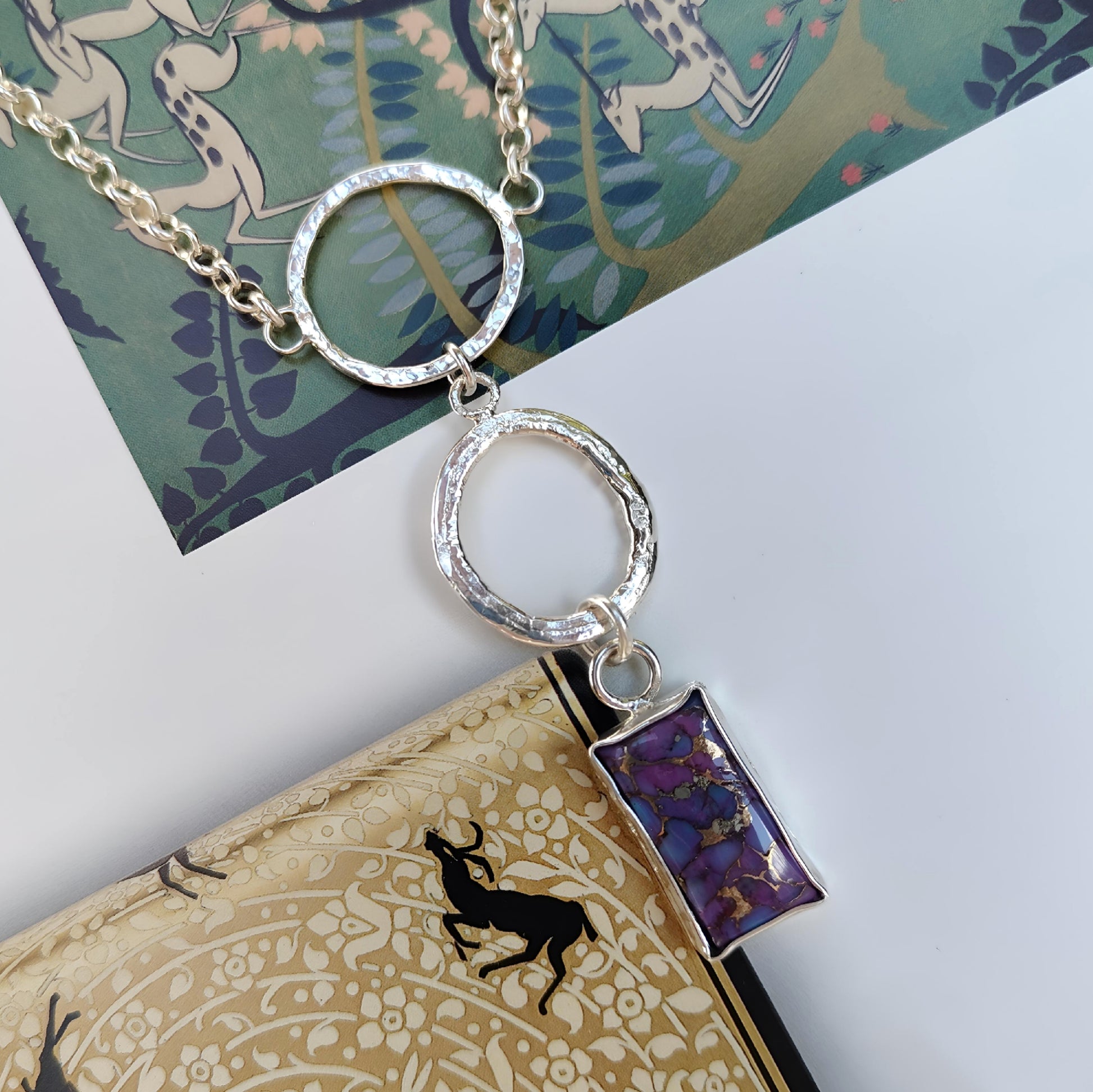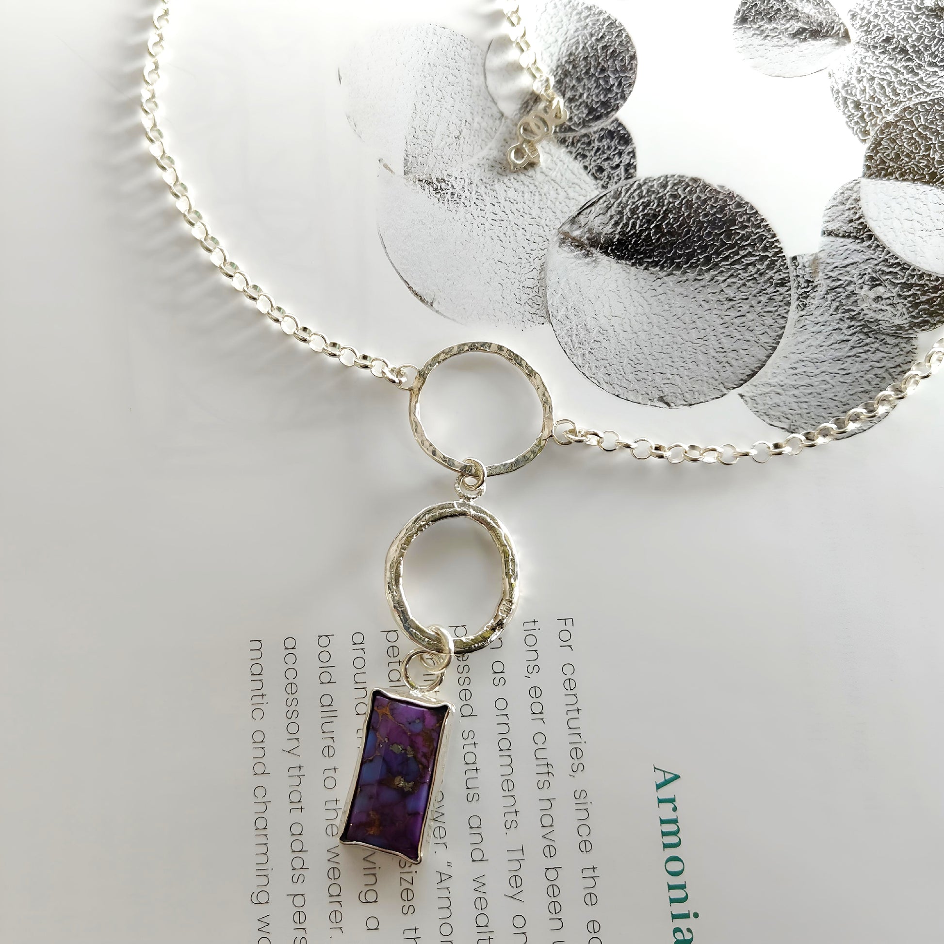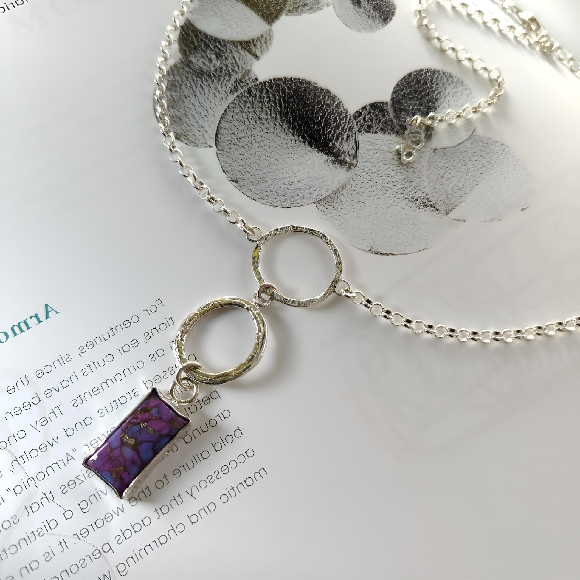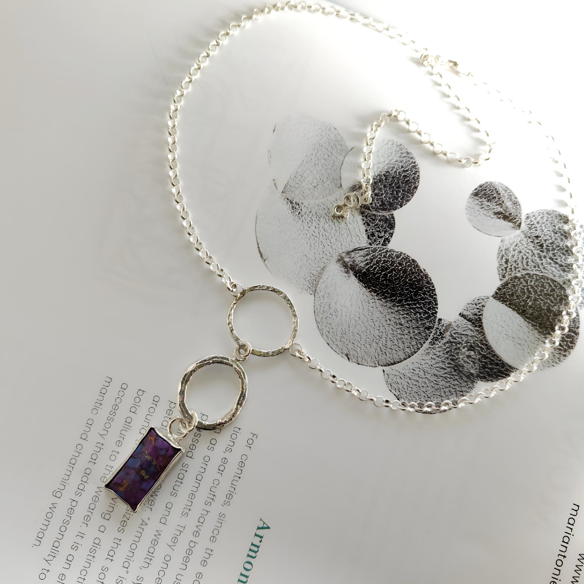 Questa collana in argento 925 unisce eleganza e audacia, caratterizzata da un design ispirato allo stile brutalista. Il pendente è composto da un doppio cerchio in argento, dalla lavorazione grezza e decisa, che conferisce al gioiello un aspetto unico e contemporaneo. Al centro, una pietra turchese viola aggiunge un tocco di colore intenso e vibrante, creando un contrasto affascinante con la durezza dell'argento.