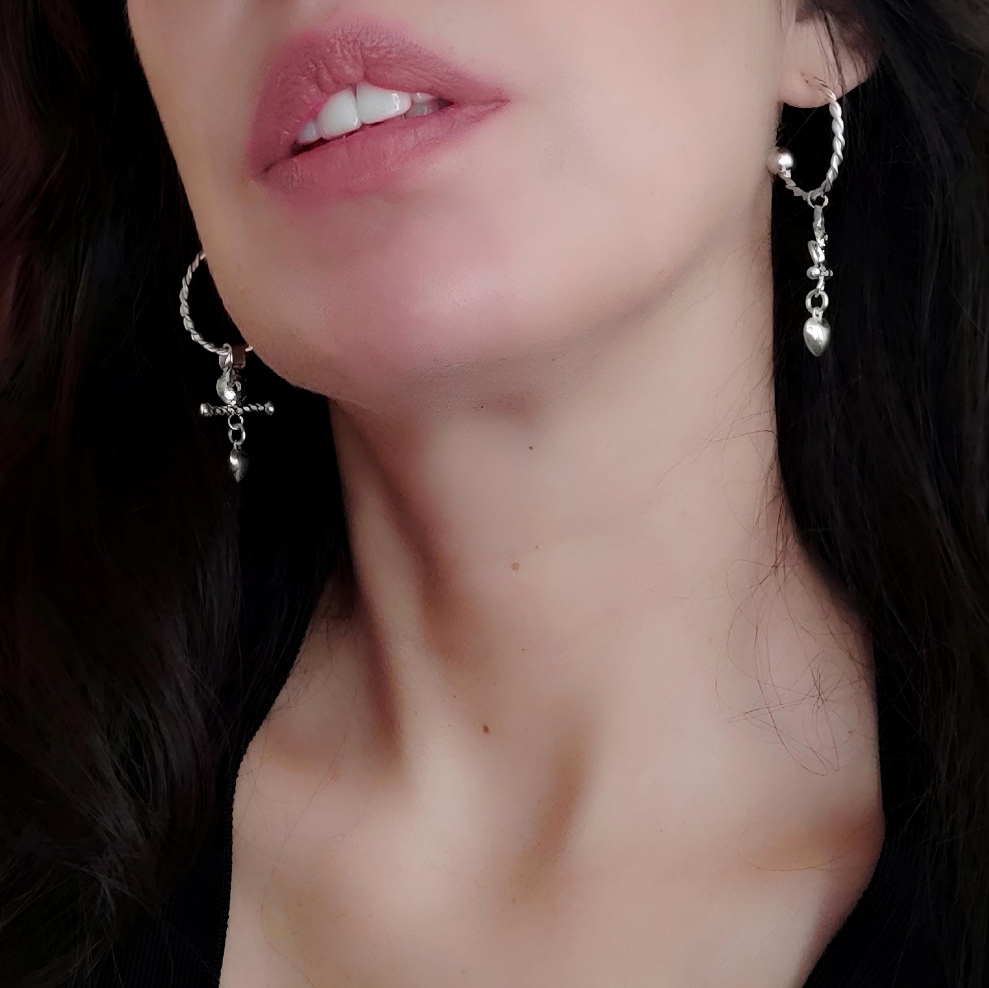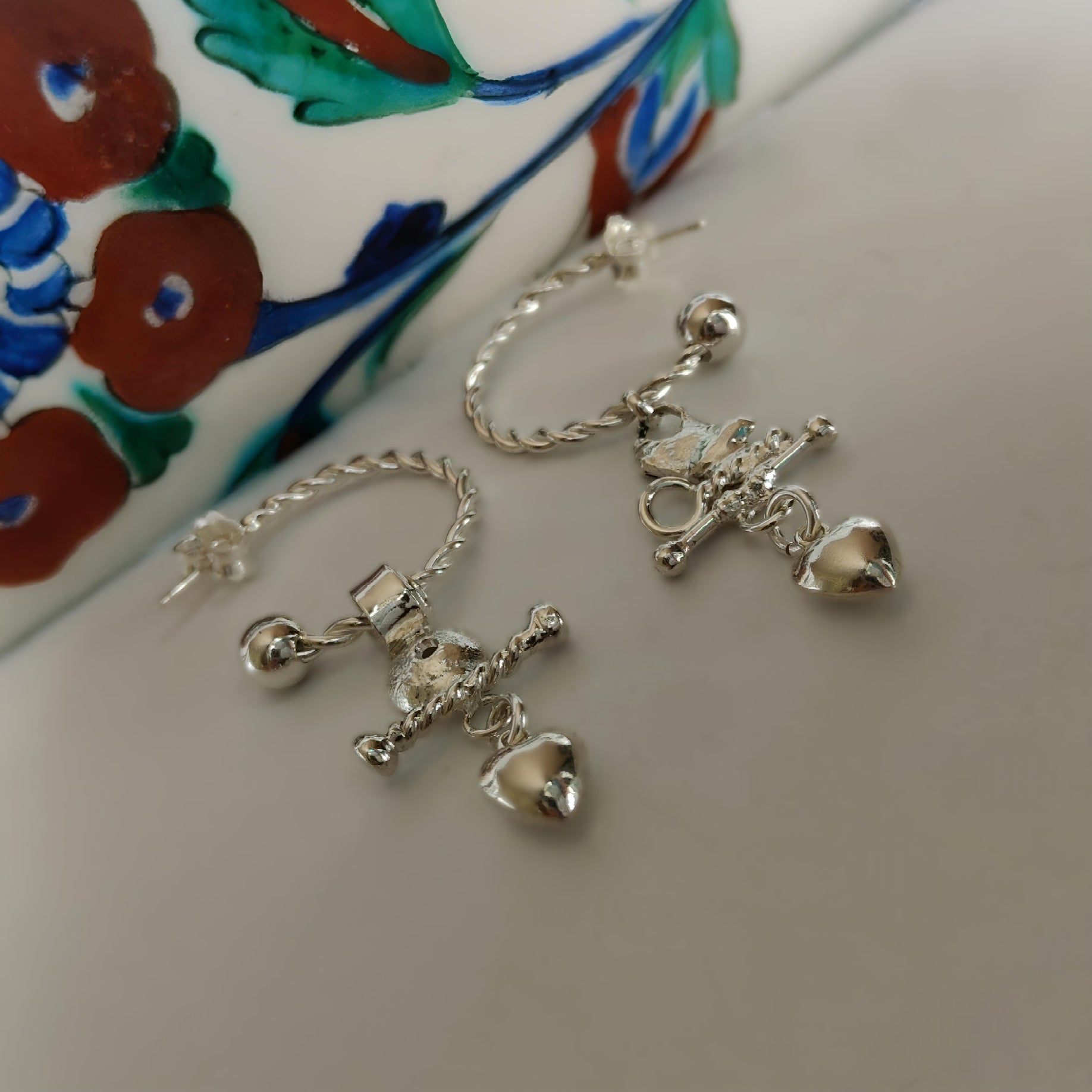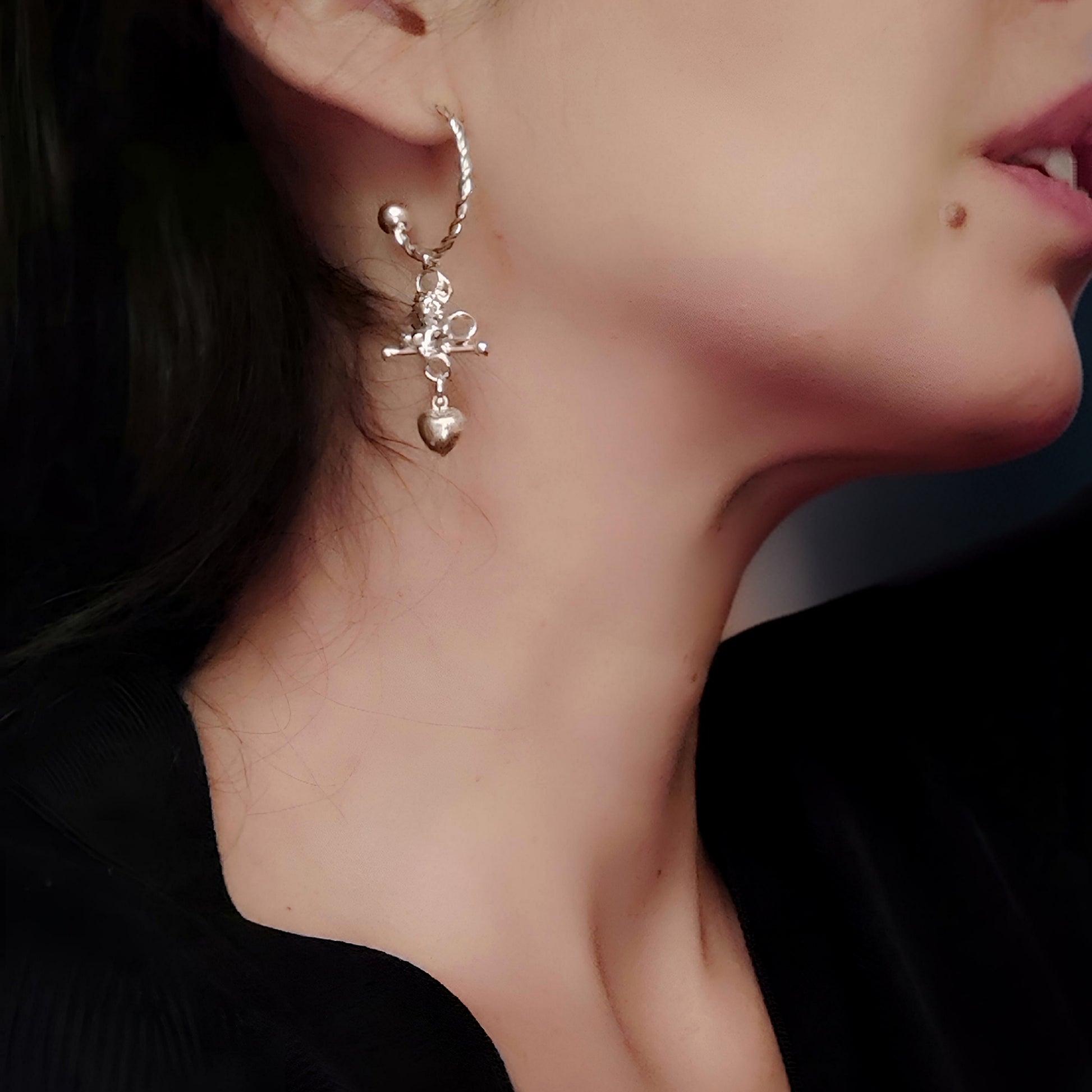 Orecchini a cerchio in argento 925, realizzati a mano con una lavorazione intrecciata che cattura la luce in ogni movimento. Il pendente con cuore bombato e barra decorativa aggiunge carattere e originalità a un design pulito e contemporaneo.