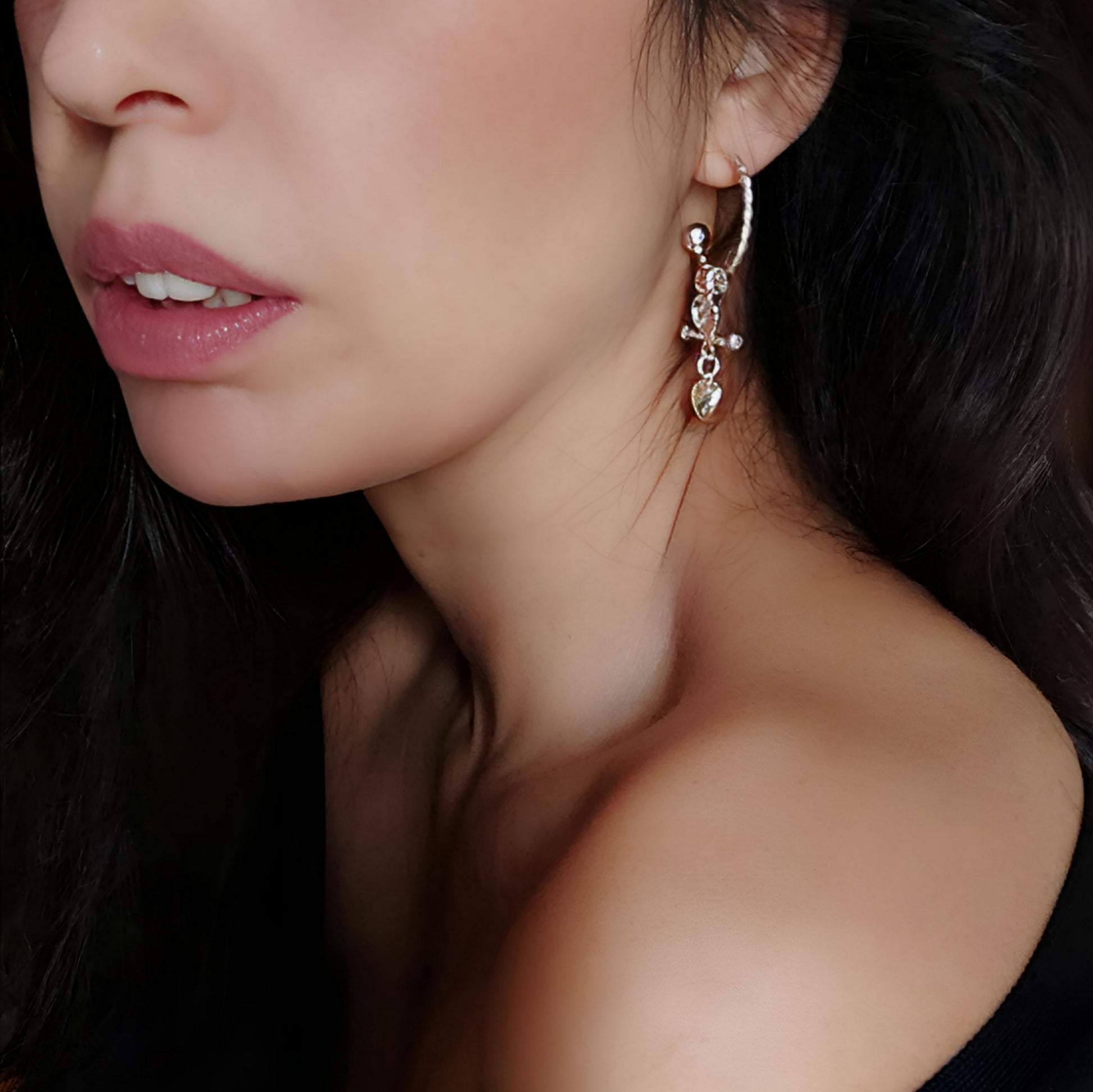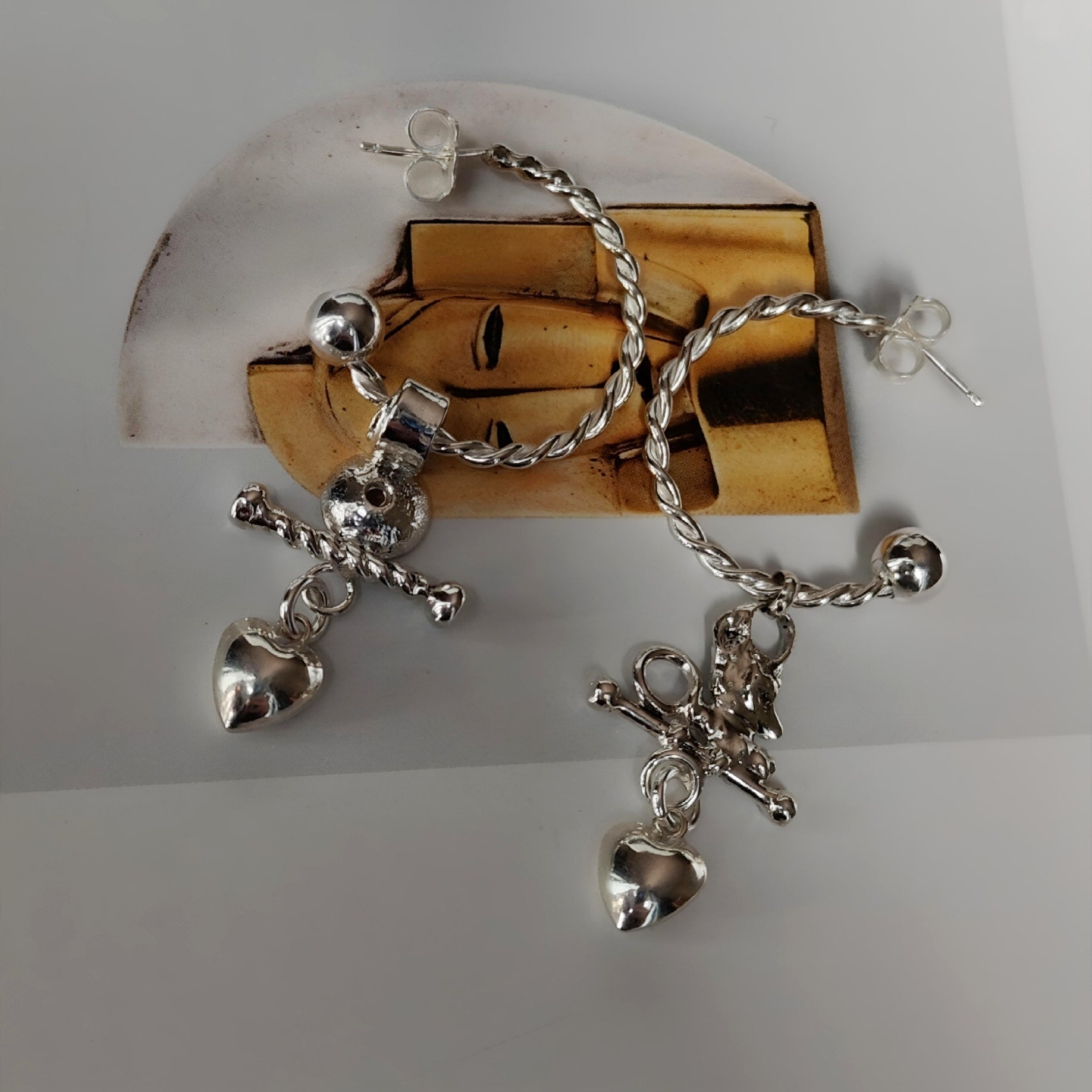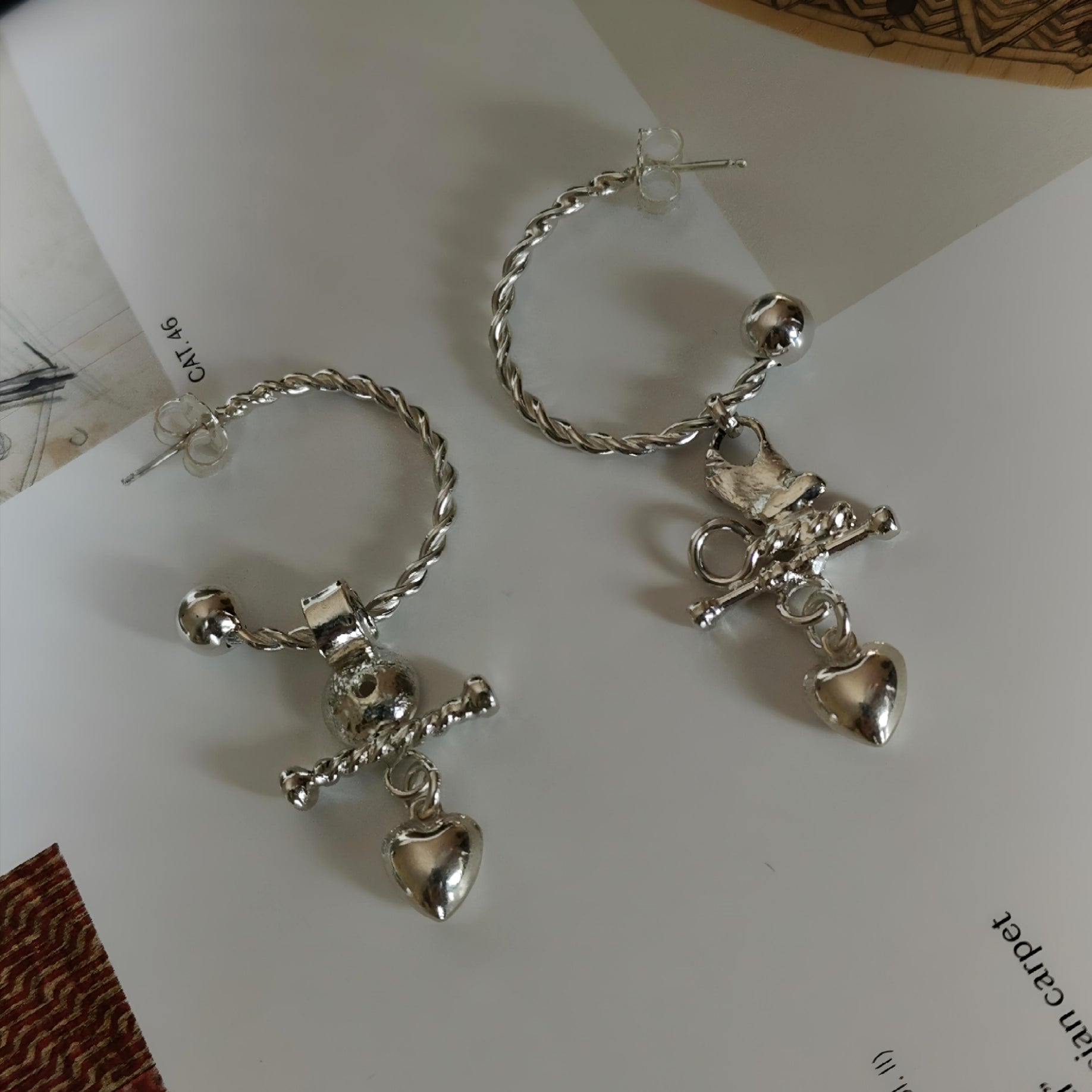 Orecchini a cerchio in argento 925, realizzati a mano con una lavorazione intrecciata che cattura la luce in ogni movimento. Il pendente con cuore bombato e barra decorativa aggiunge carattere e originalità a un design pulito e contemporaneo.