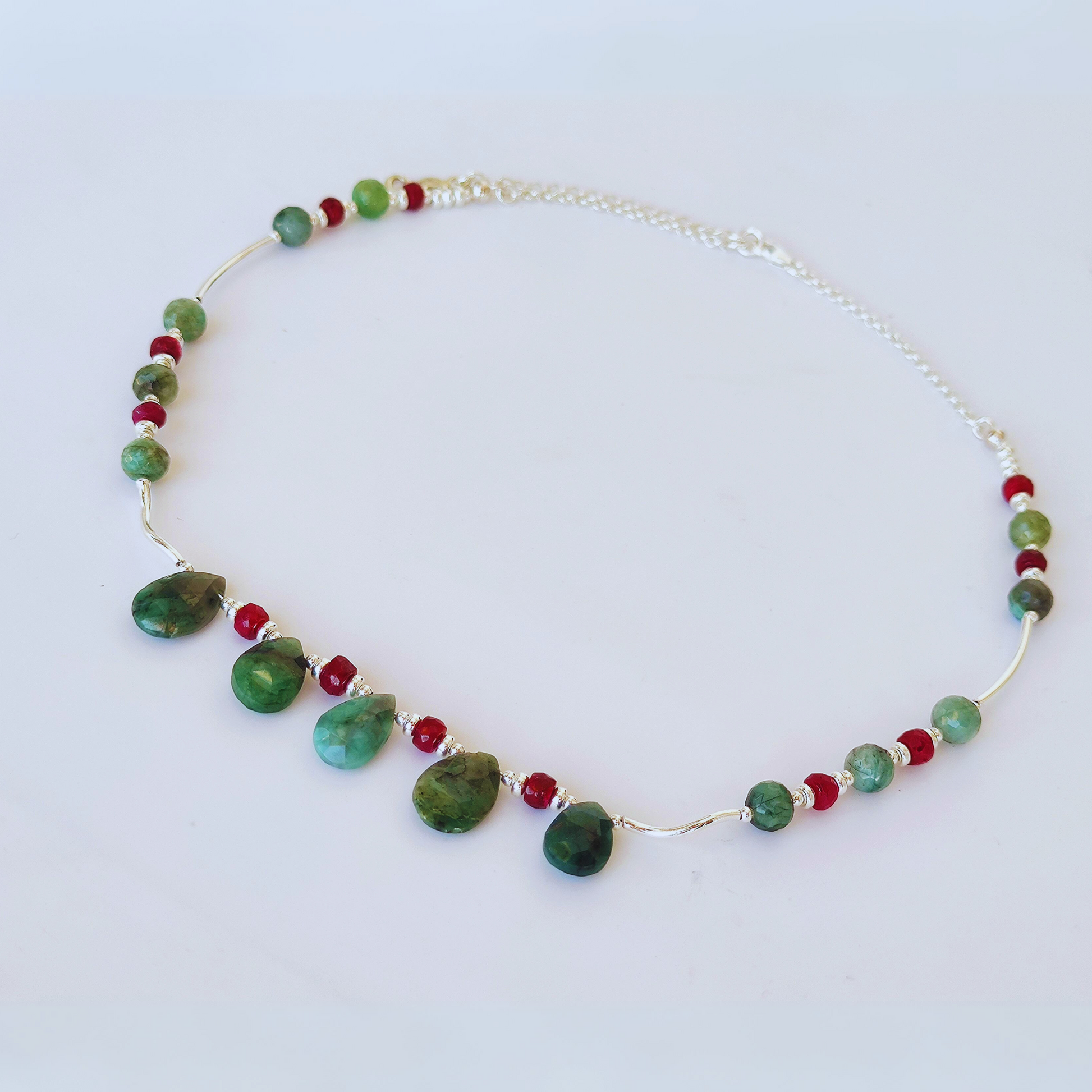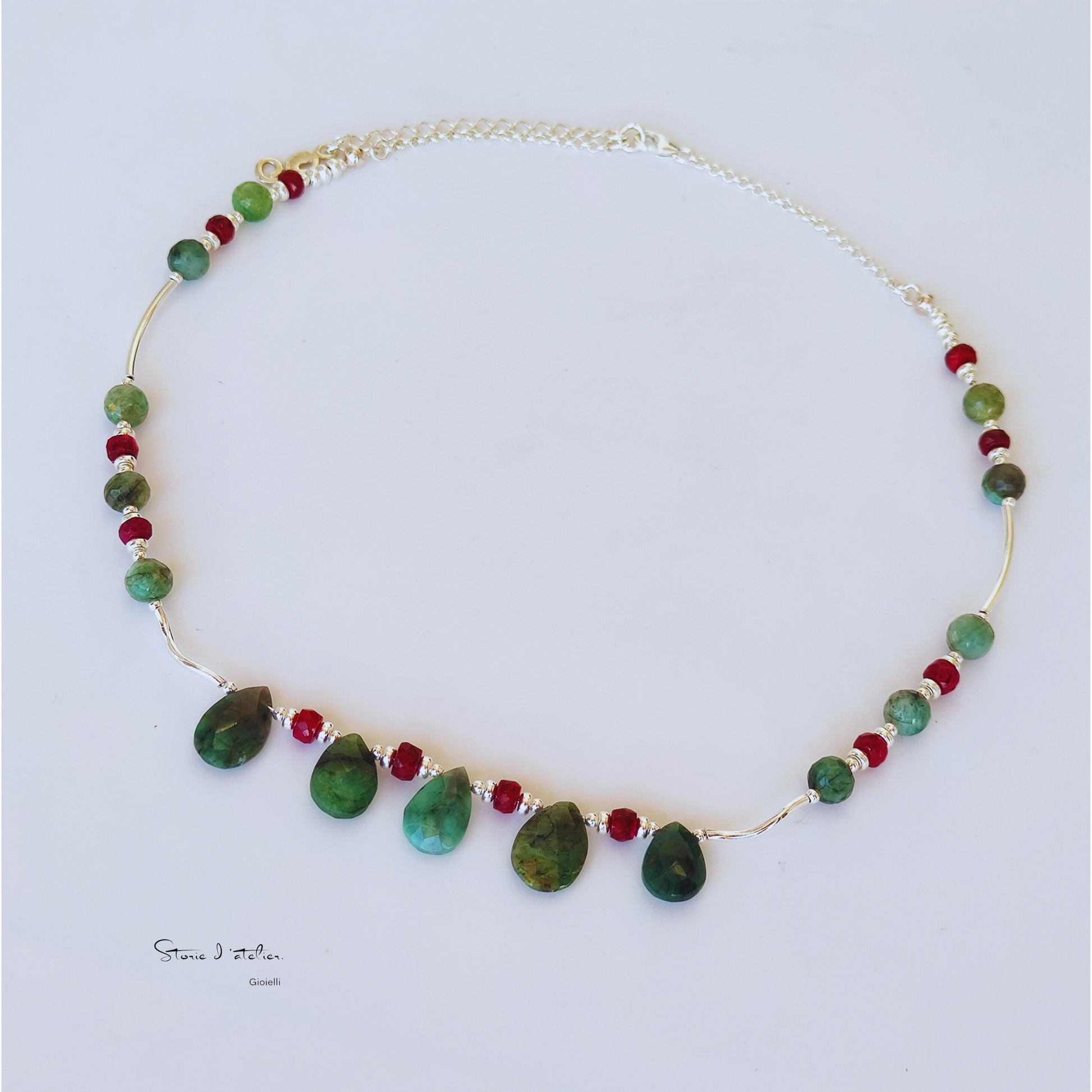 Collana girocollo in argento con pietre naturali - Briolettes smeraldo sfaccettate, pietre smeraldo tonde sfaccettate, rubini piccoli sfaccettati. Completamente realizzata a mano, un perfetto connubio tra cura per i dettagli e armonia di colori delle pietre naturali. Perfetta per essere abbinata agli orecchini e ai bracciali in argento e pietra delle creazioni Storie D’Atelier.