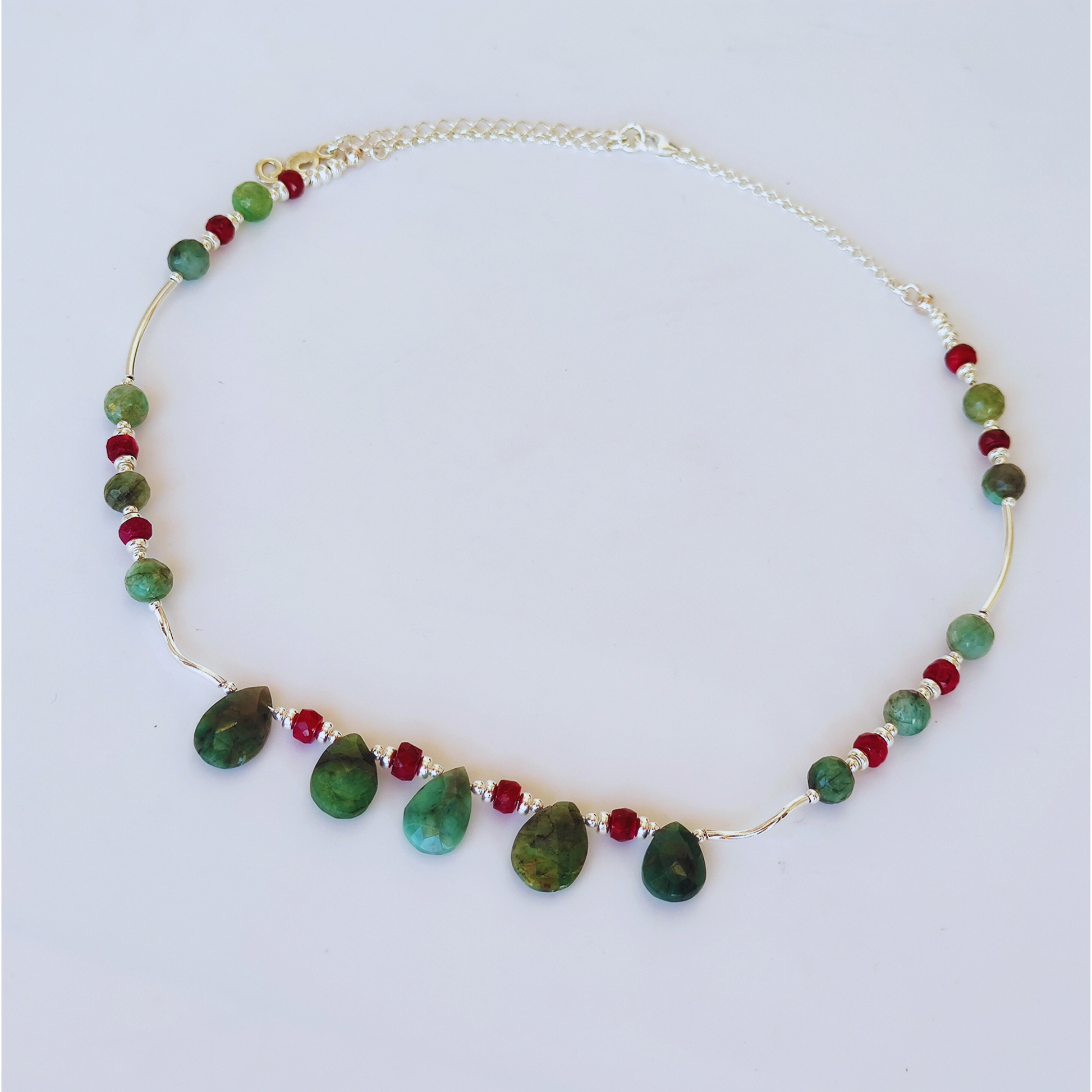 ST65 - Collana girocollo in argento 925 con briolettes in smeraldo e rubini sfaccettati