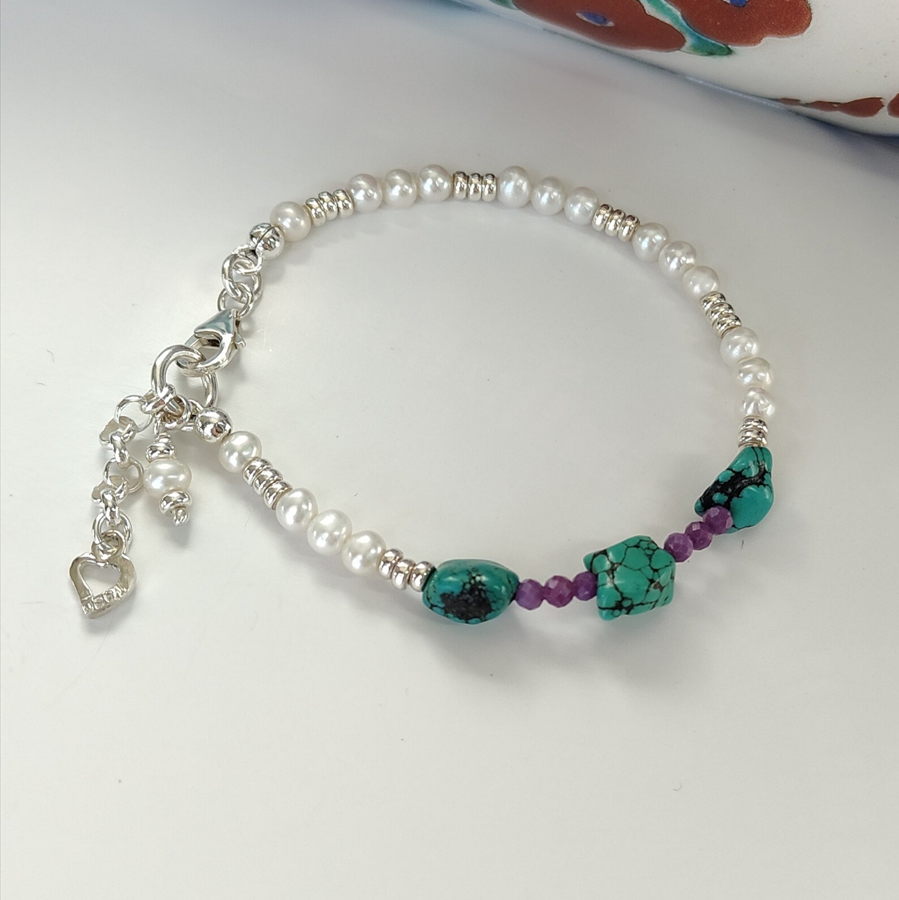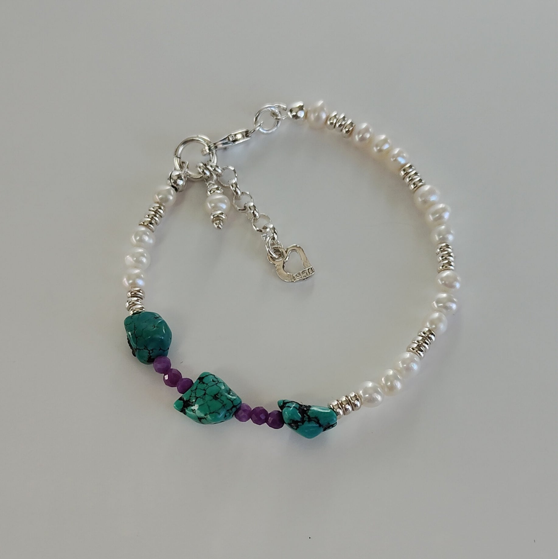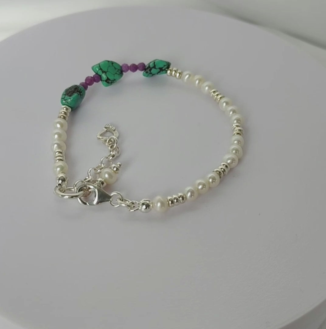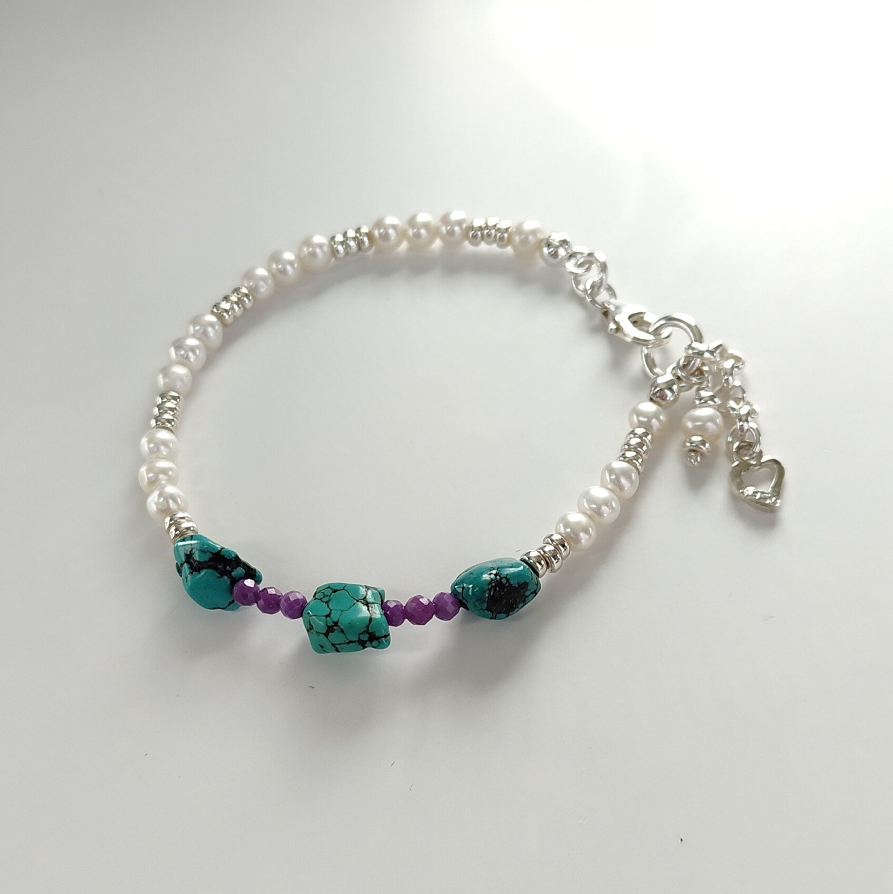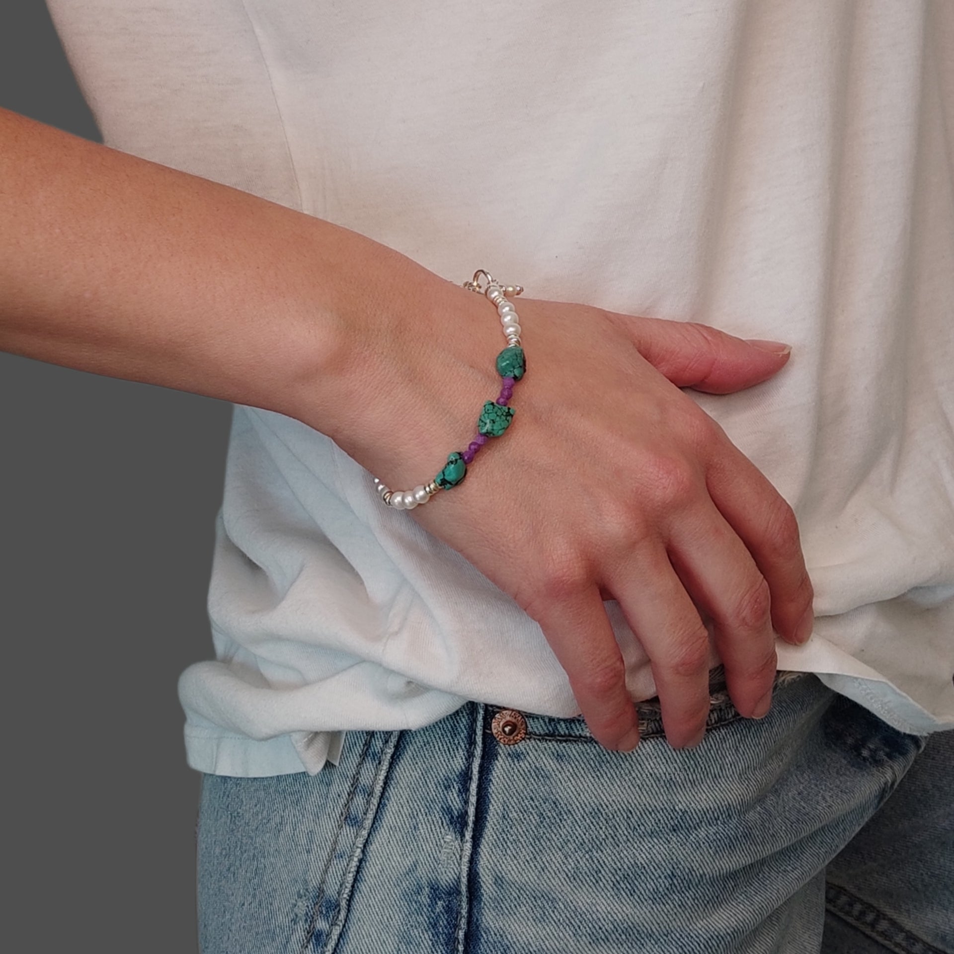 Bracciale in argento 925 con perle d'acqua dolce e pietre naturali in: lepidolite sfaccettata e turchese