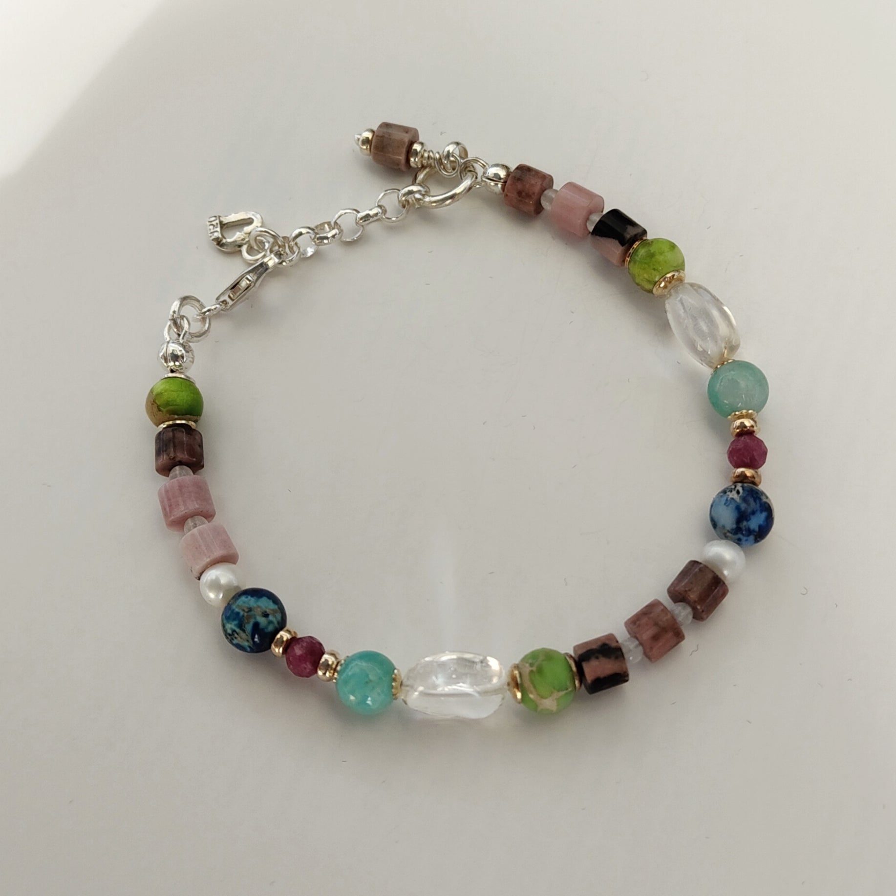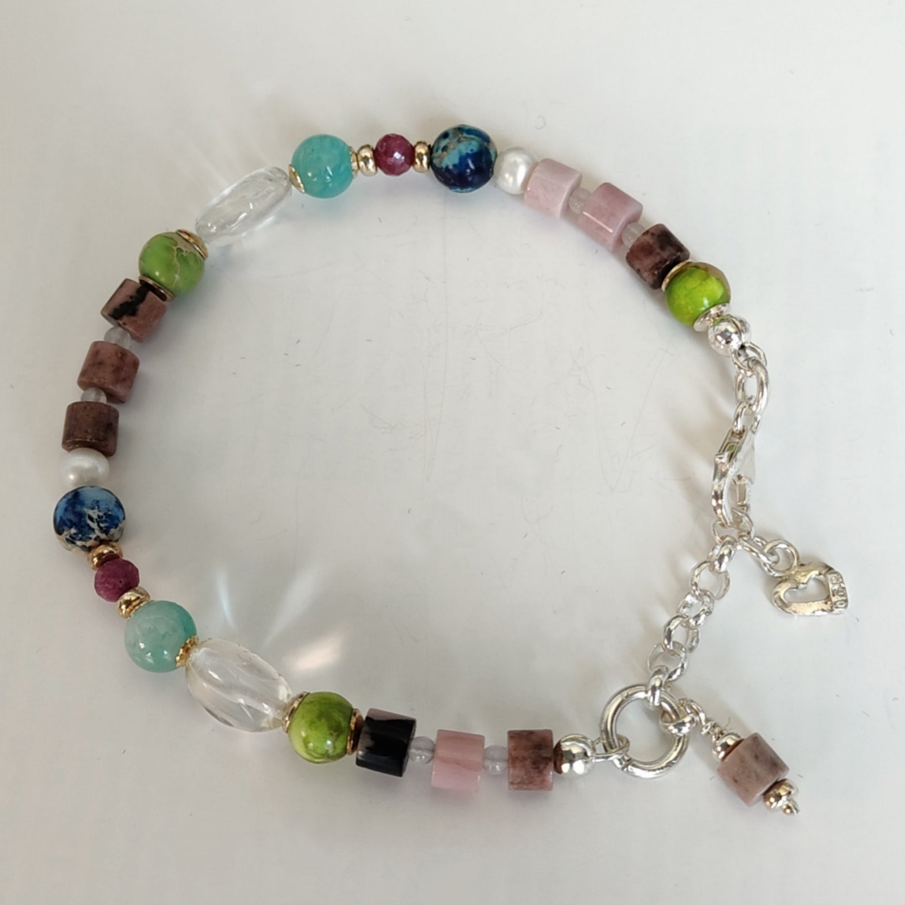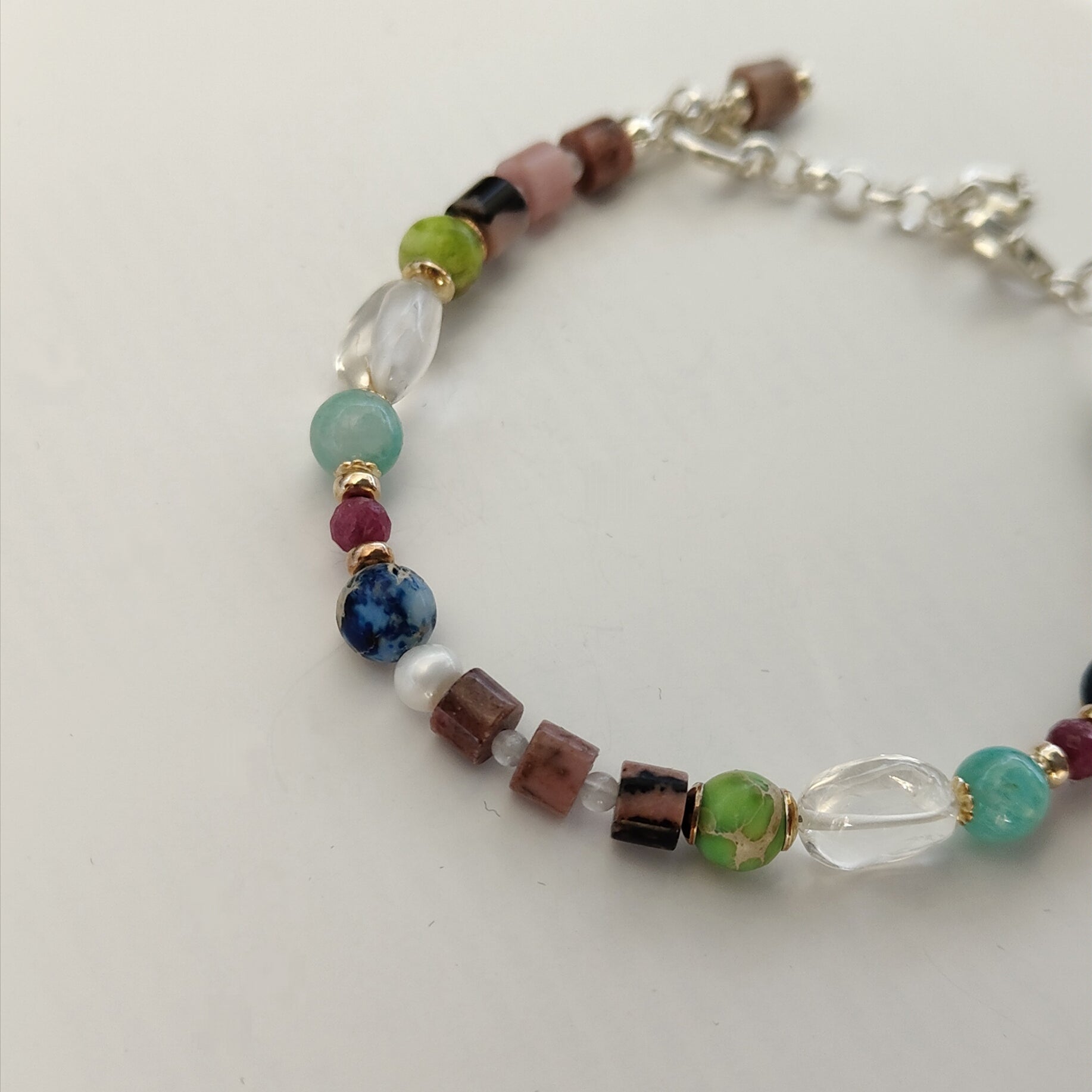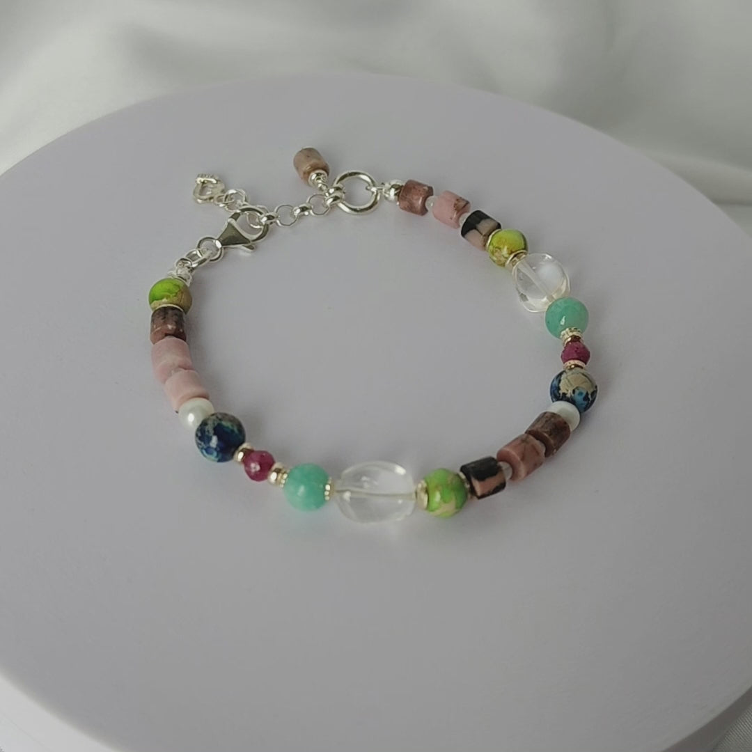 Bracciale in argento 925 con perle d'acqua dolce e pietre naturali in: rubini sfaccettati tondi, diaspro impression verde, amazzonite, diaspro impression blu, giada bianca, rodonite e quarzo cristallo