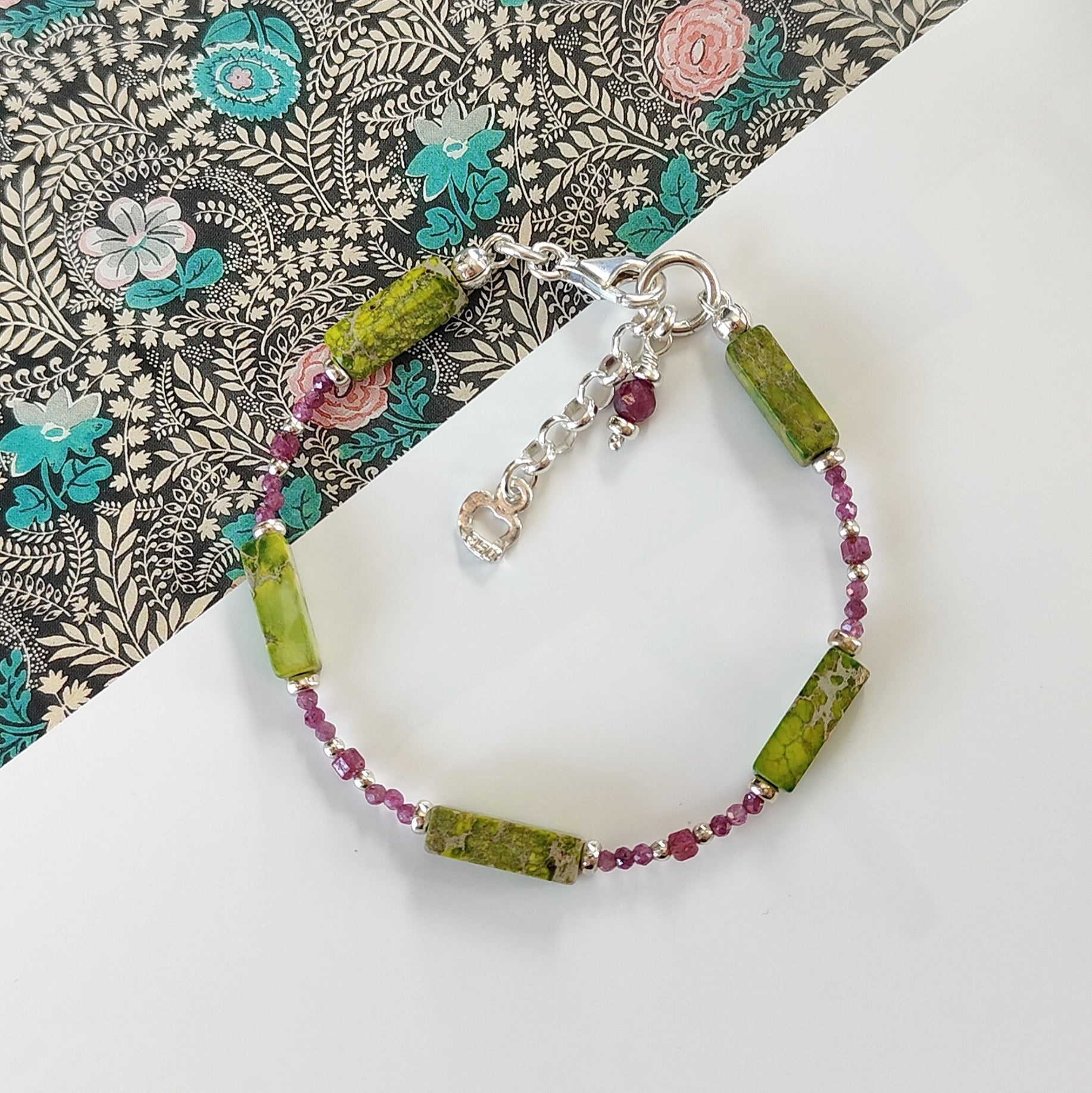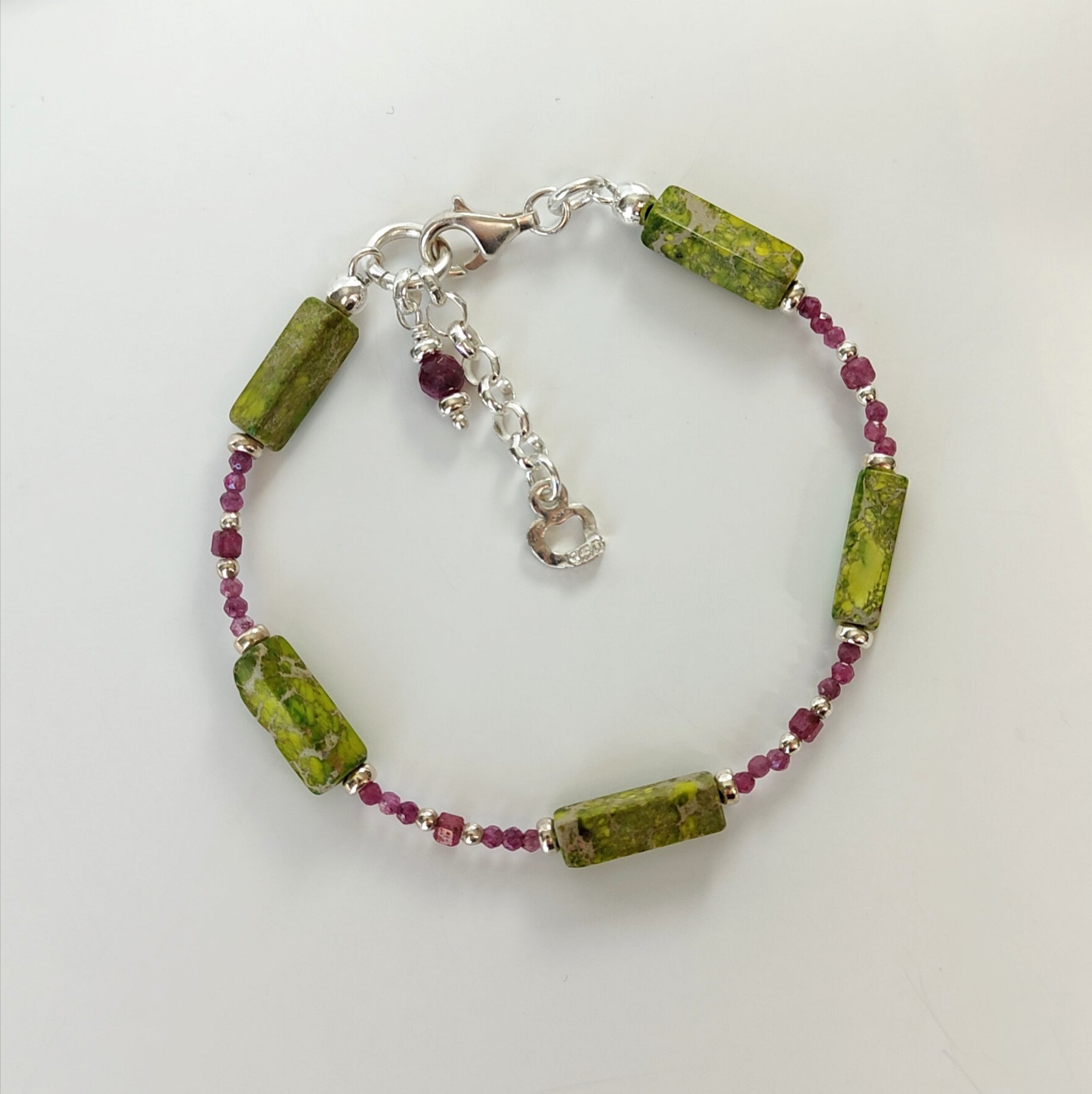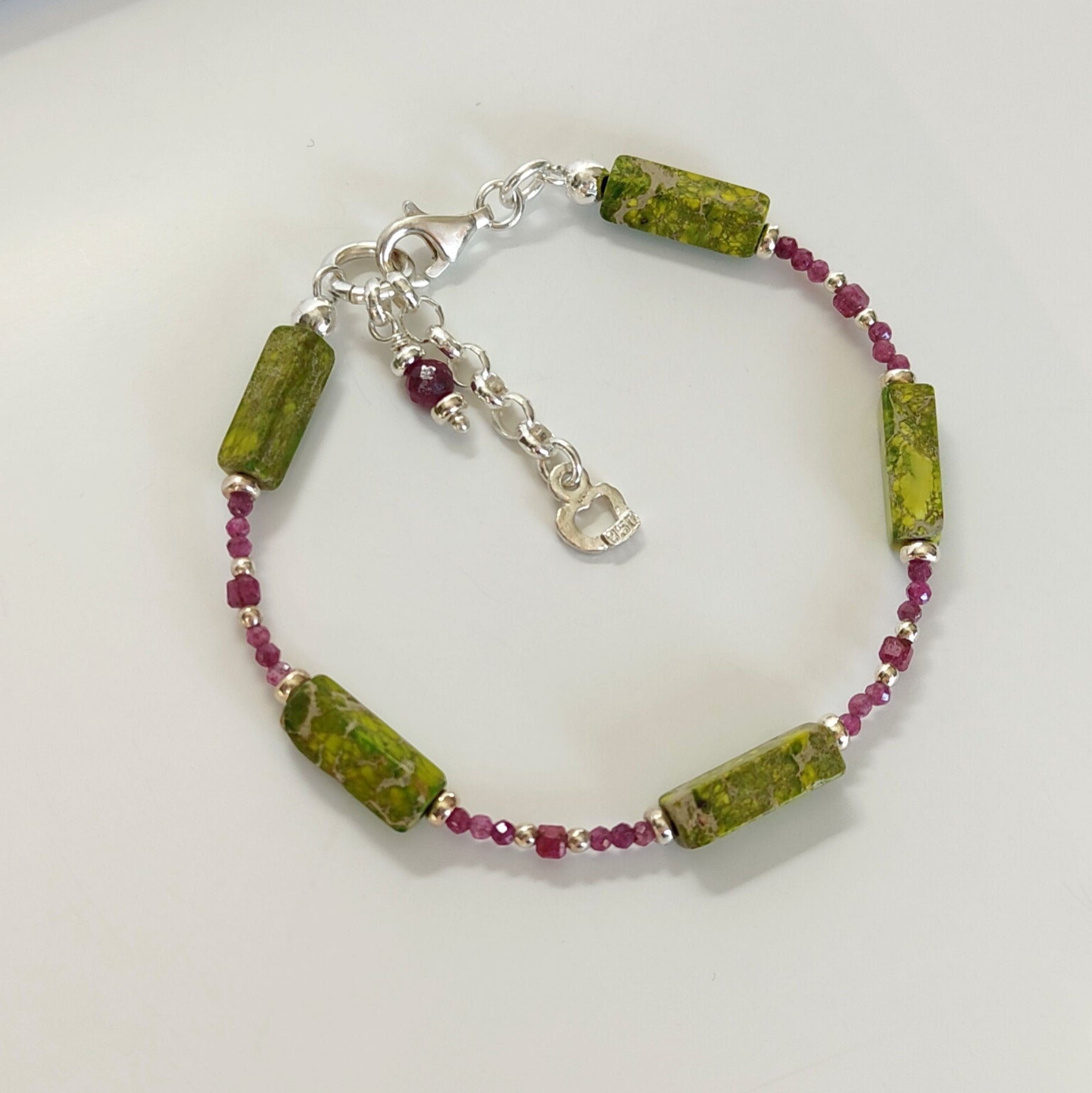 Bracciale in argento 925 con pietre naturali in: rubini sfaccettati tondi e cubici, diaspro verde.