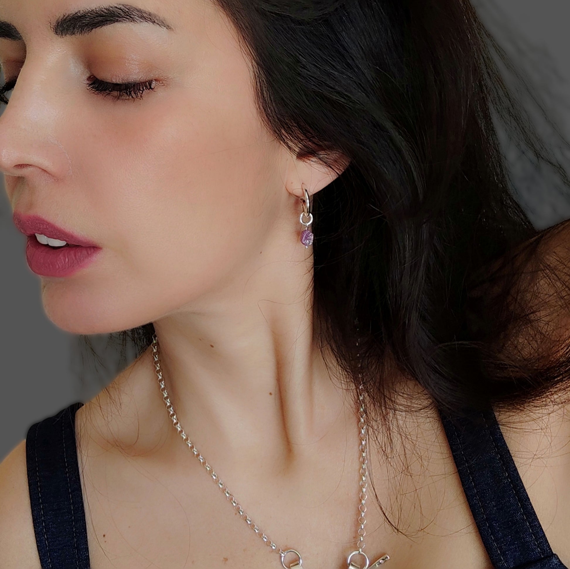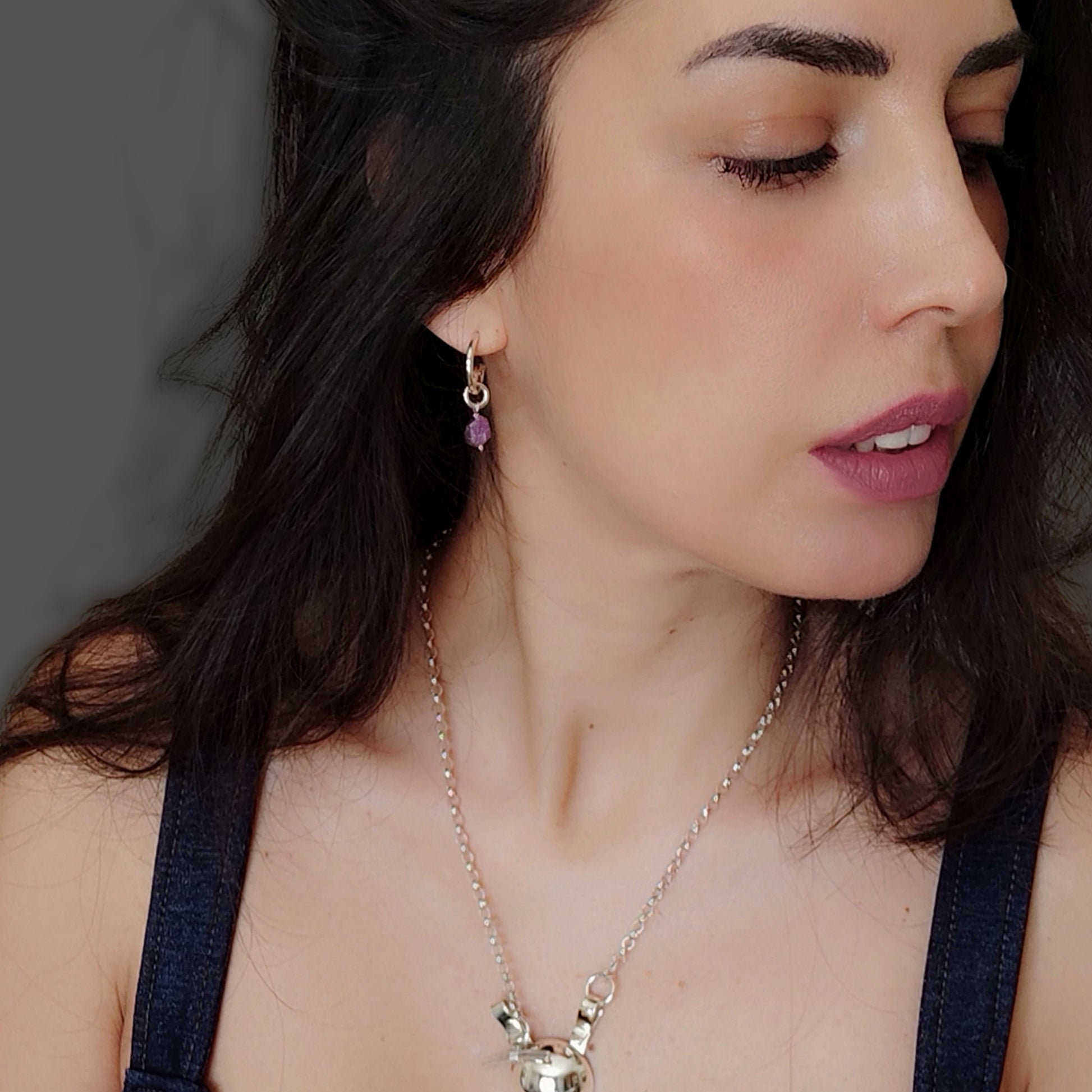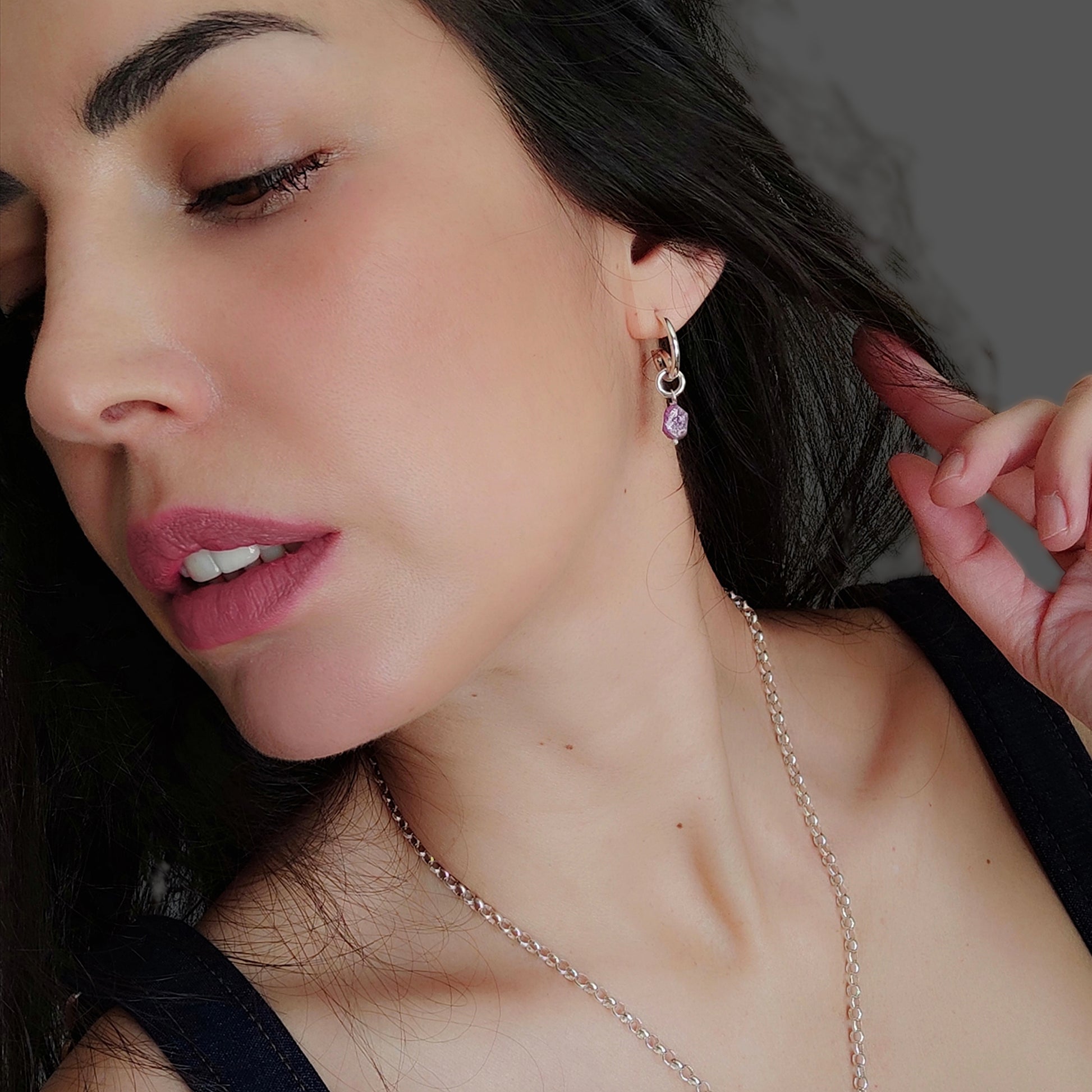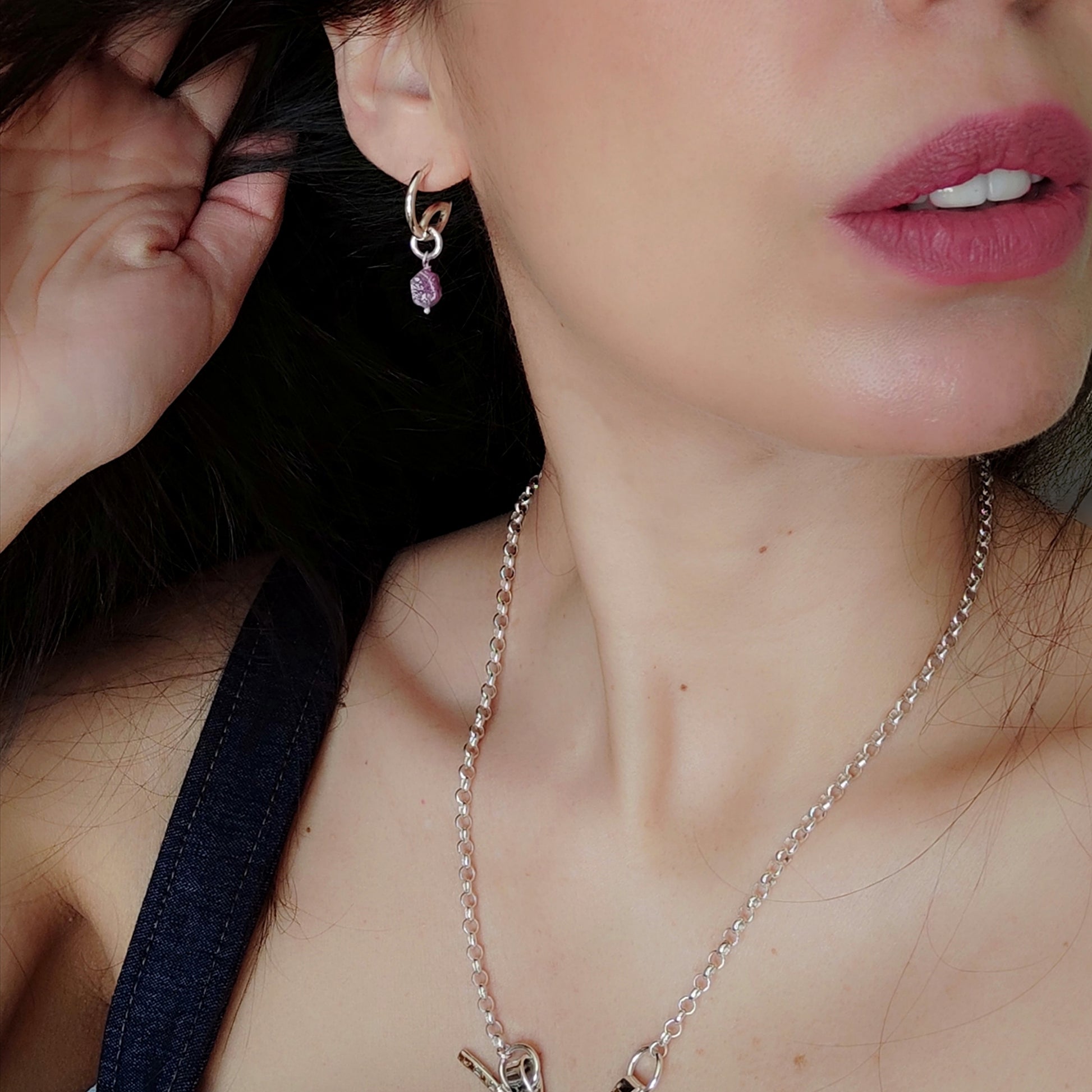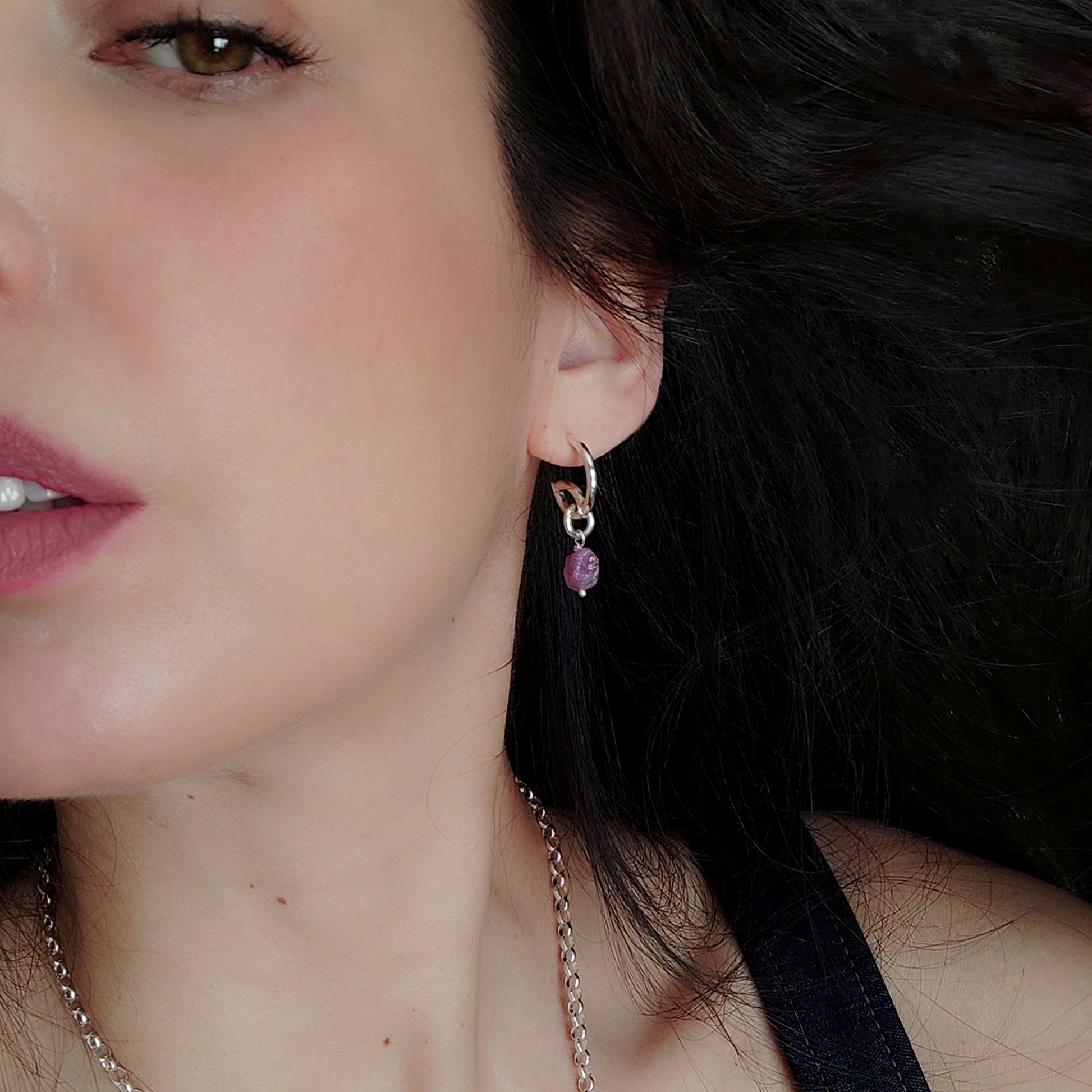 Design contemporaneo e anima autentica. Questi orecchini in argento 925 colpiscono per la loro forma sinuosa e moderna, esaltata da una finitura lucida che cattura la luce con eleganza. A completare il design, un pendente con rubino grezzo dalle sfumature intense e naturali: ogni pietra è unica, con la sua texture irregolare che racconta l’essenza pura della materia