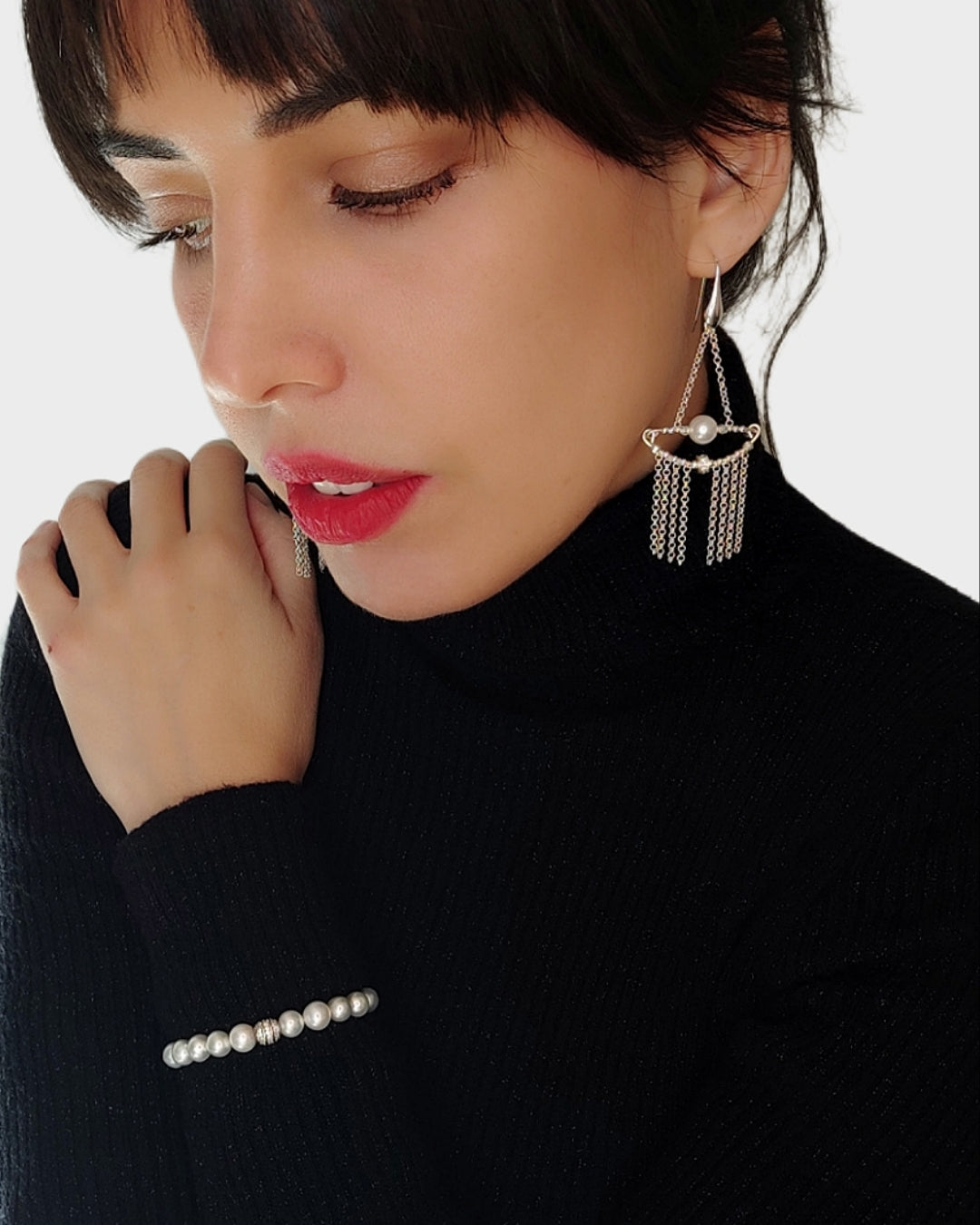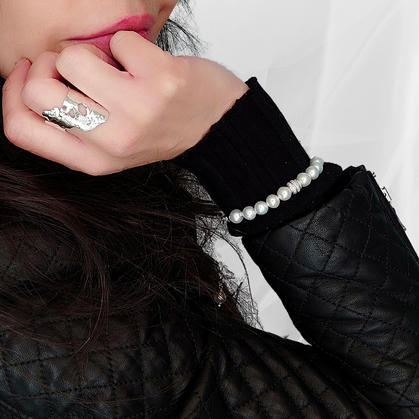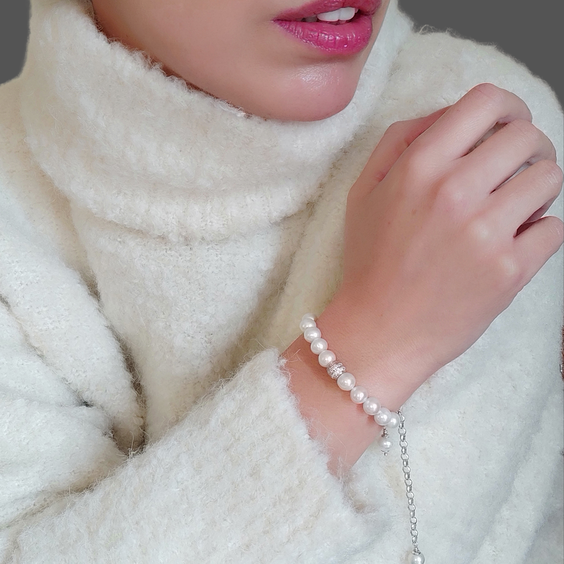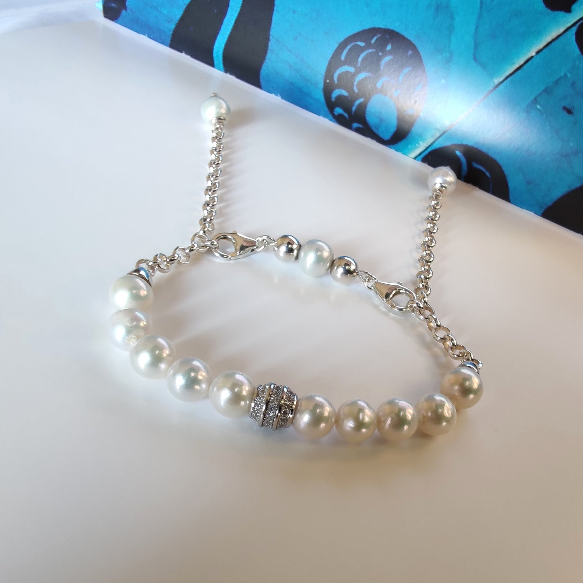 Bracciale di perle in argento 925 con zirconi decorativi.