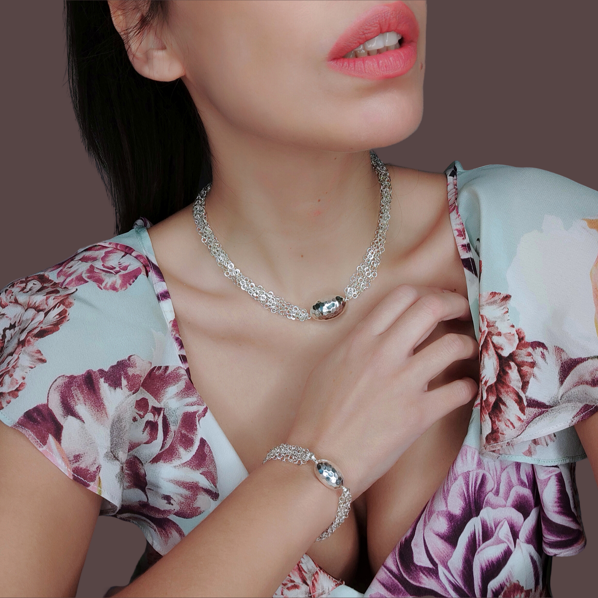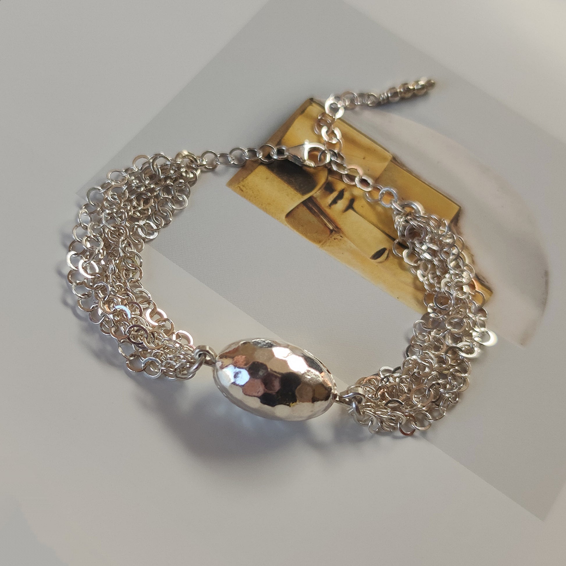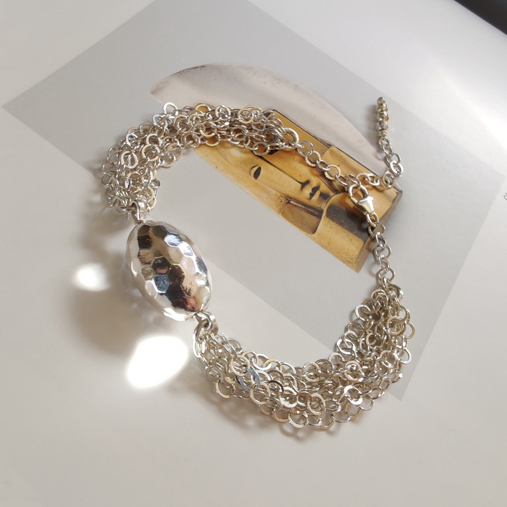 Bracciale interamente in argento 925 fatto a maglia con ovale martellato.