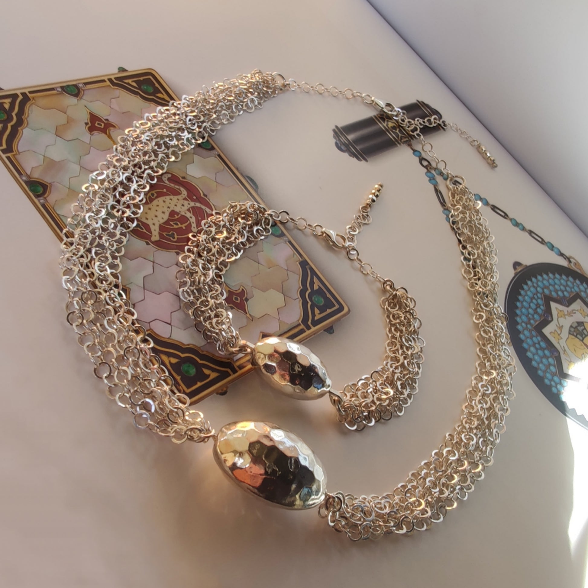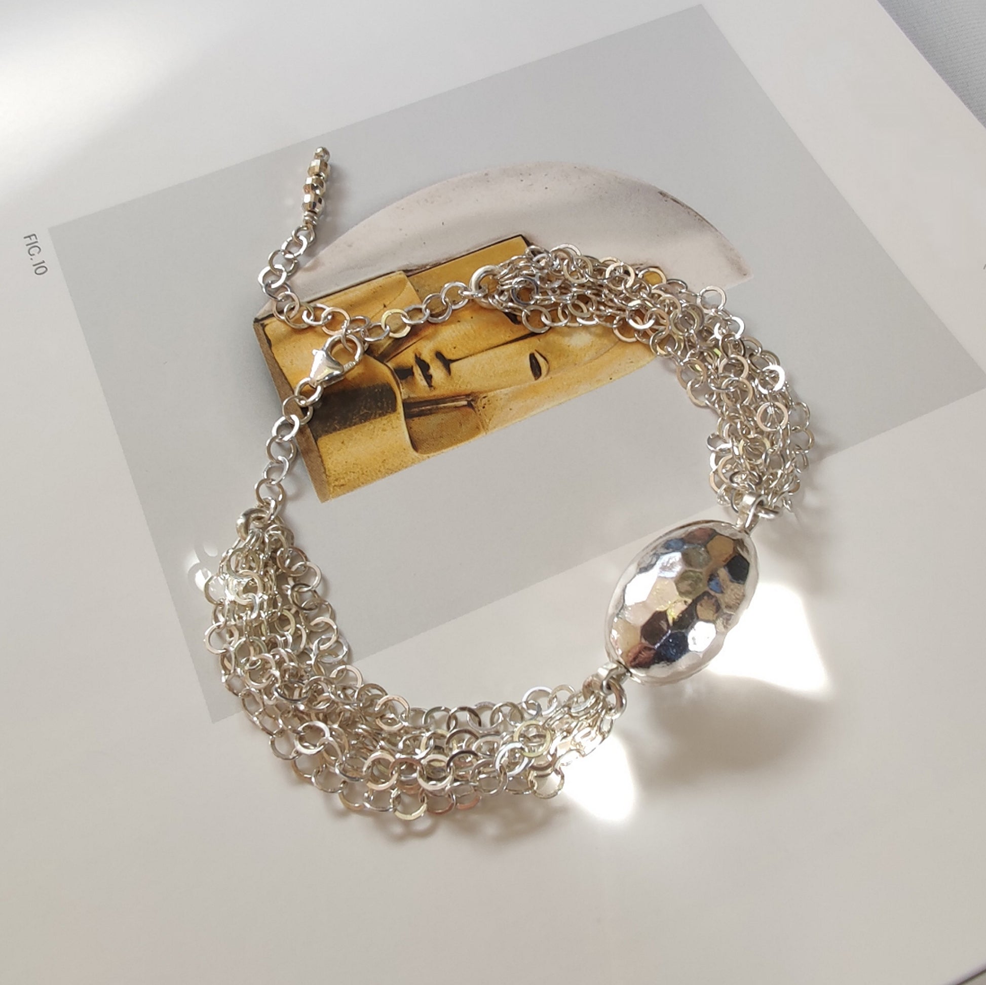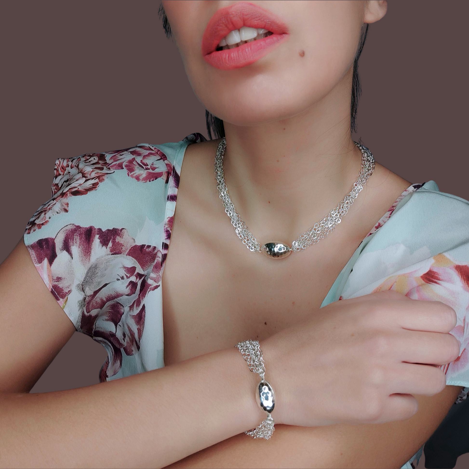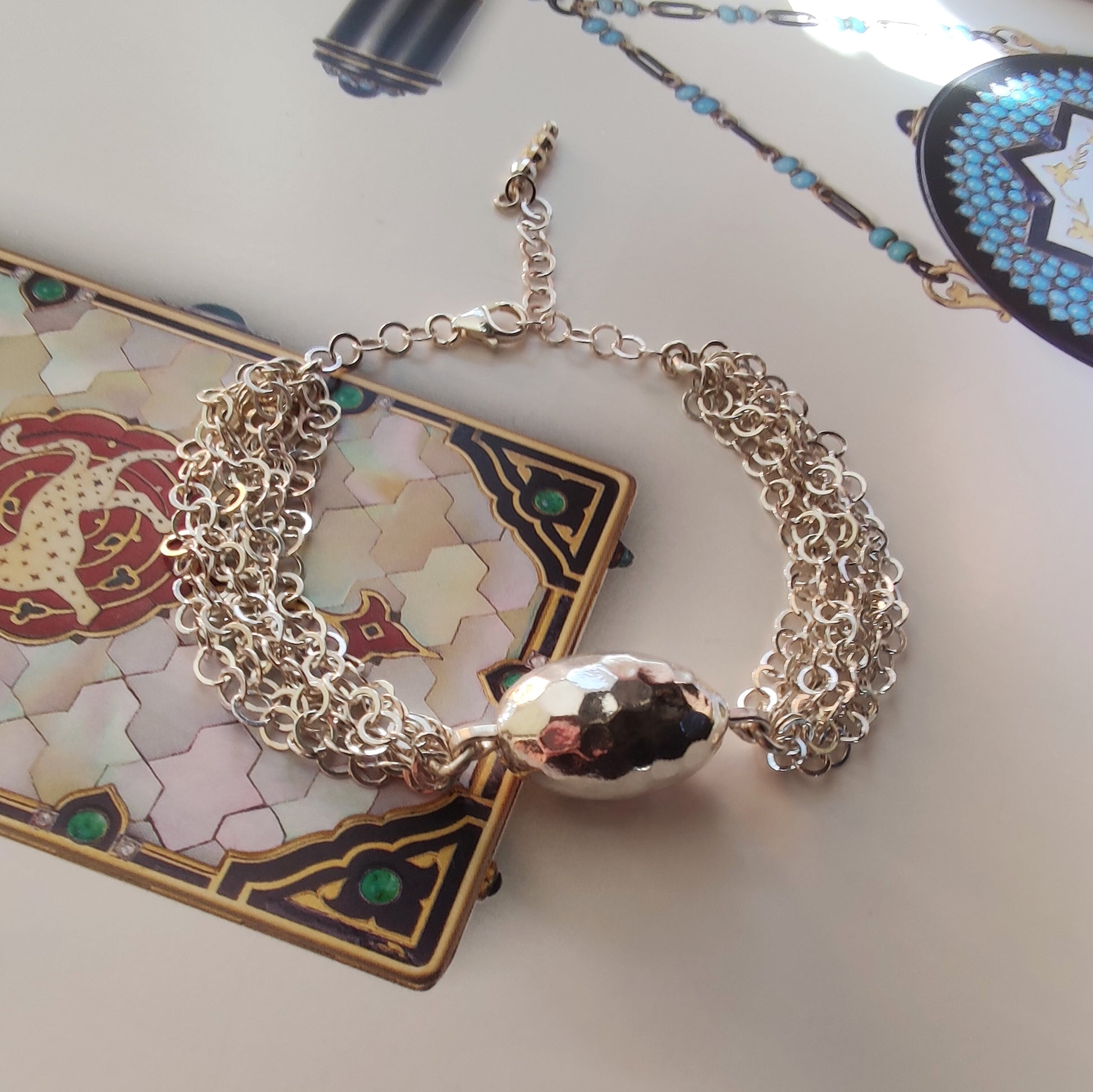 Bracciale interamente in argento 925 fatto a maglia con ovale martellato.