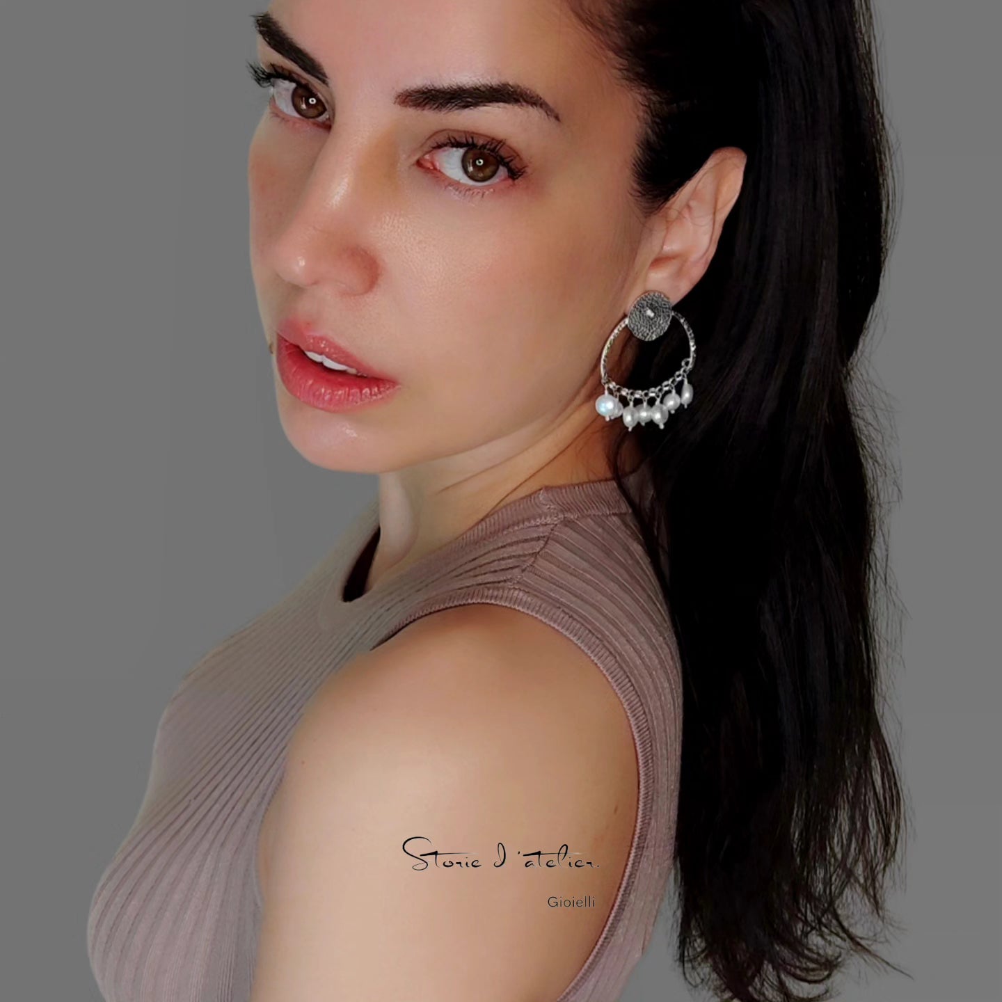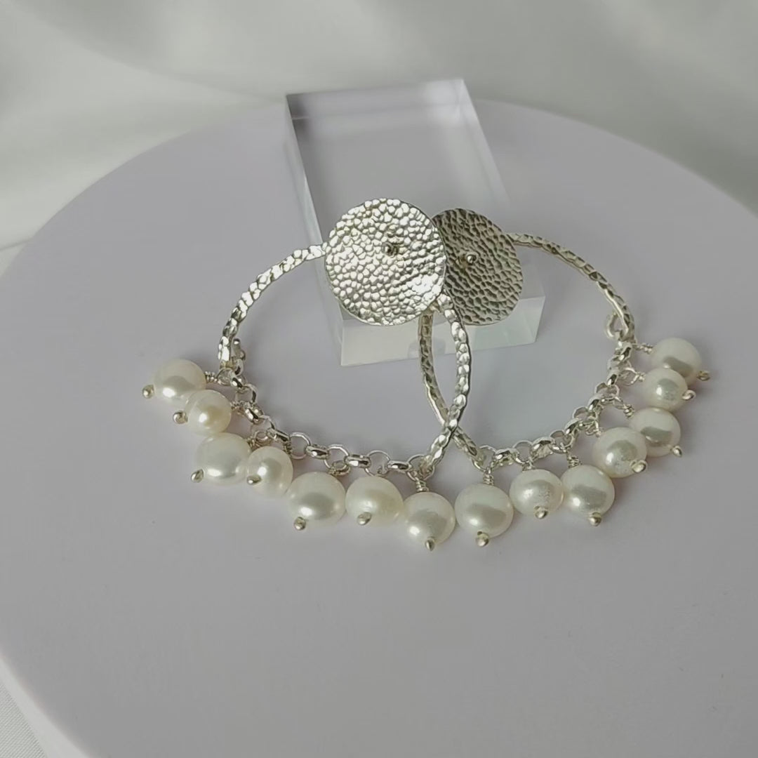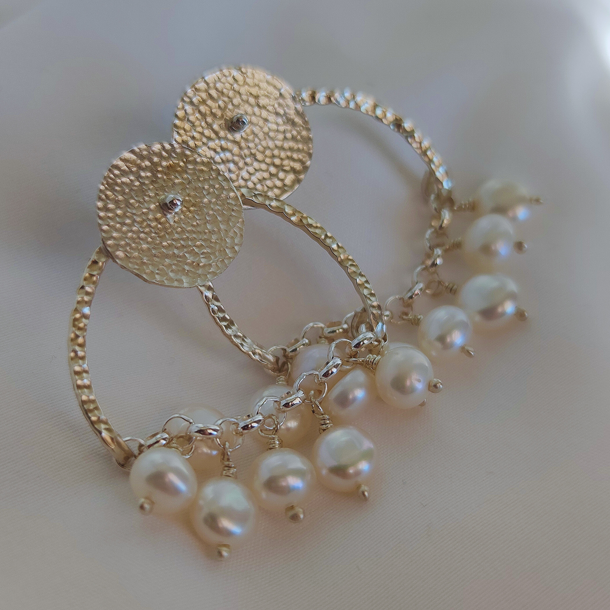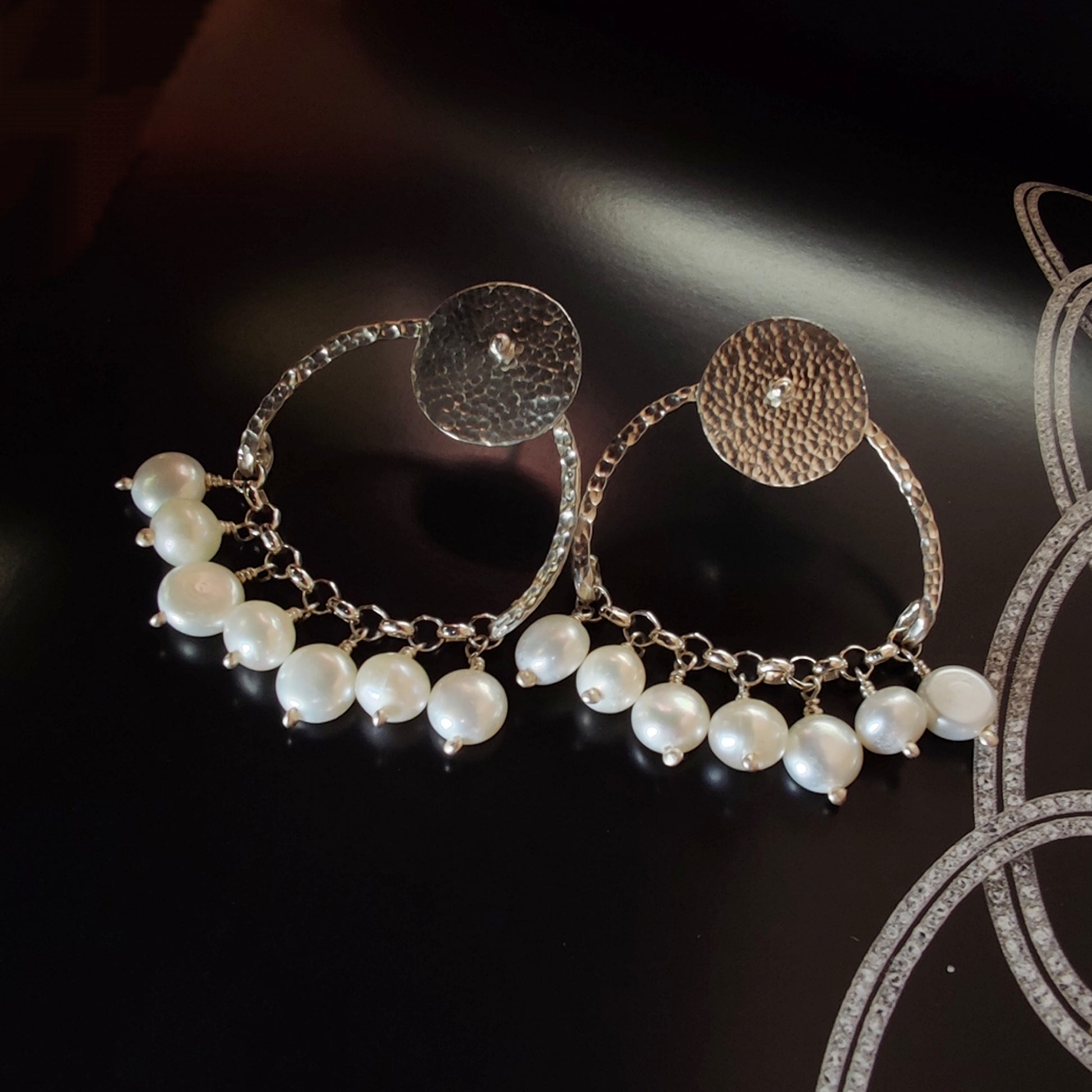 Orecchini in argento martellato 925 con perle bianche d'acqua dolce.
