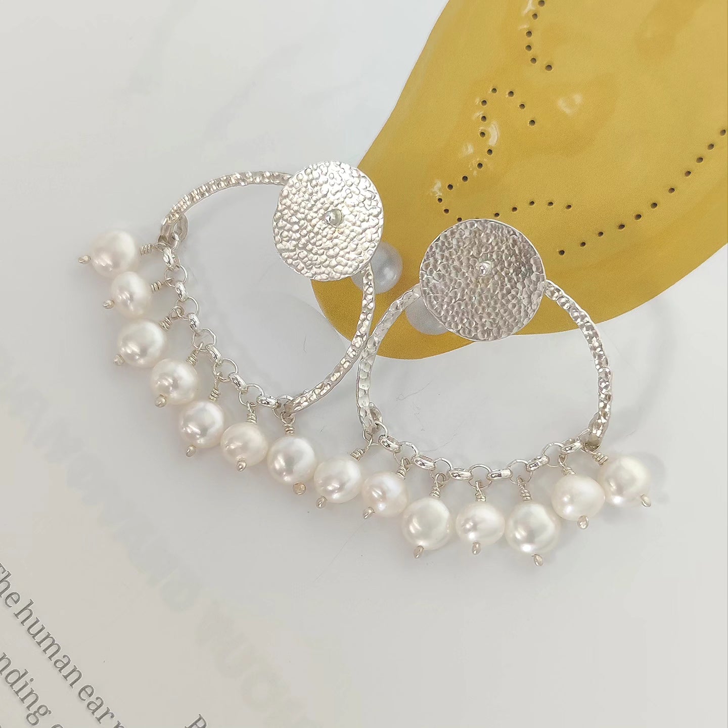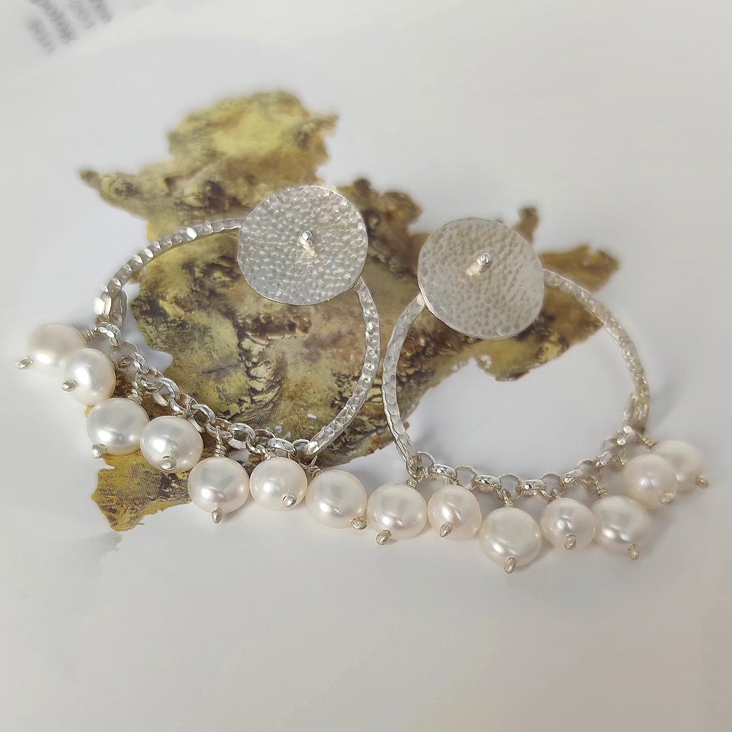 ST76 - Orecchini in argento martellato 925 con perle bianche d'acqua dolce