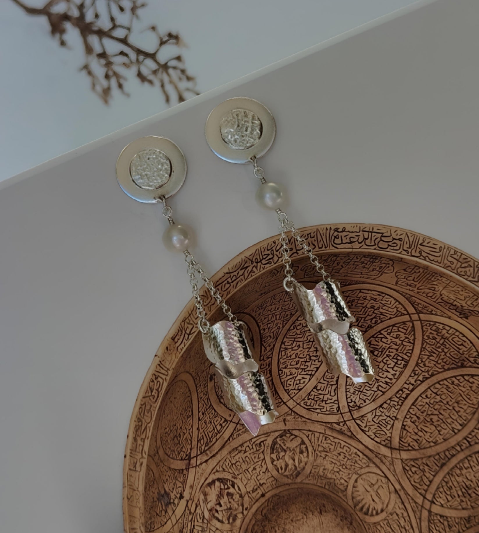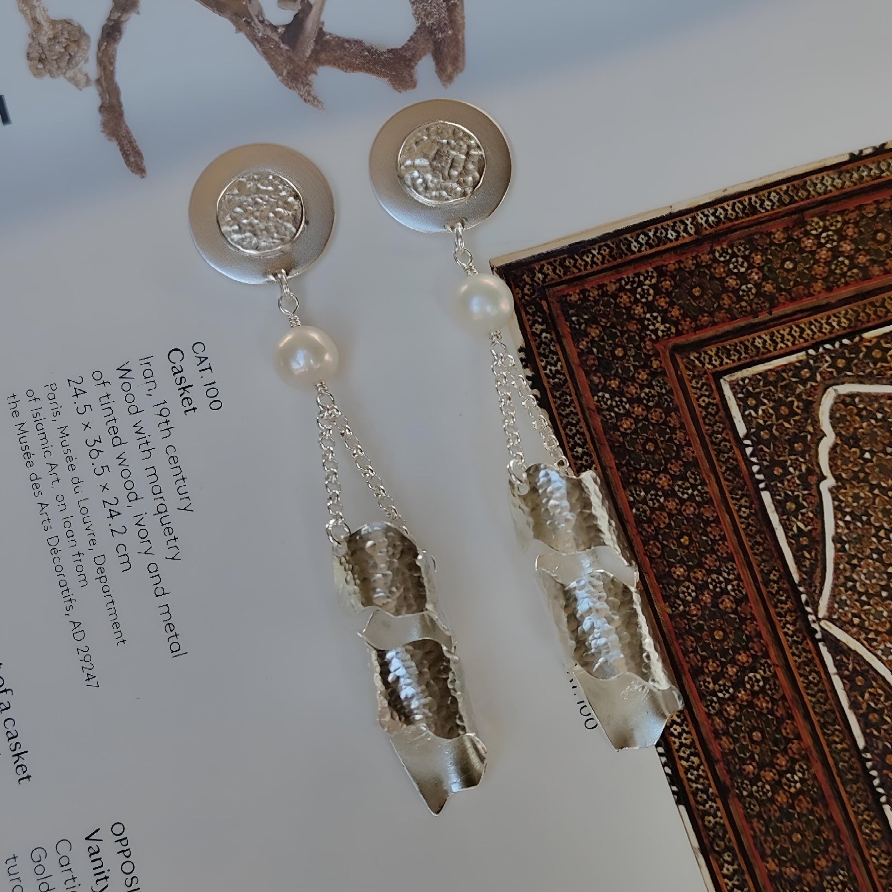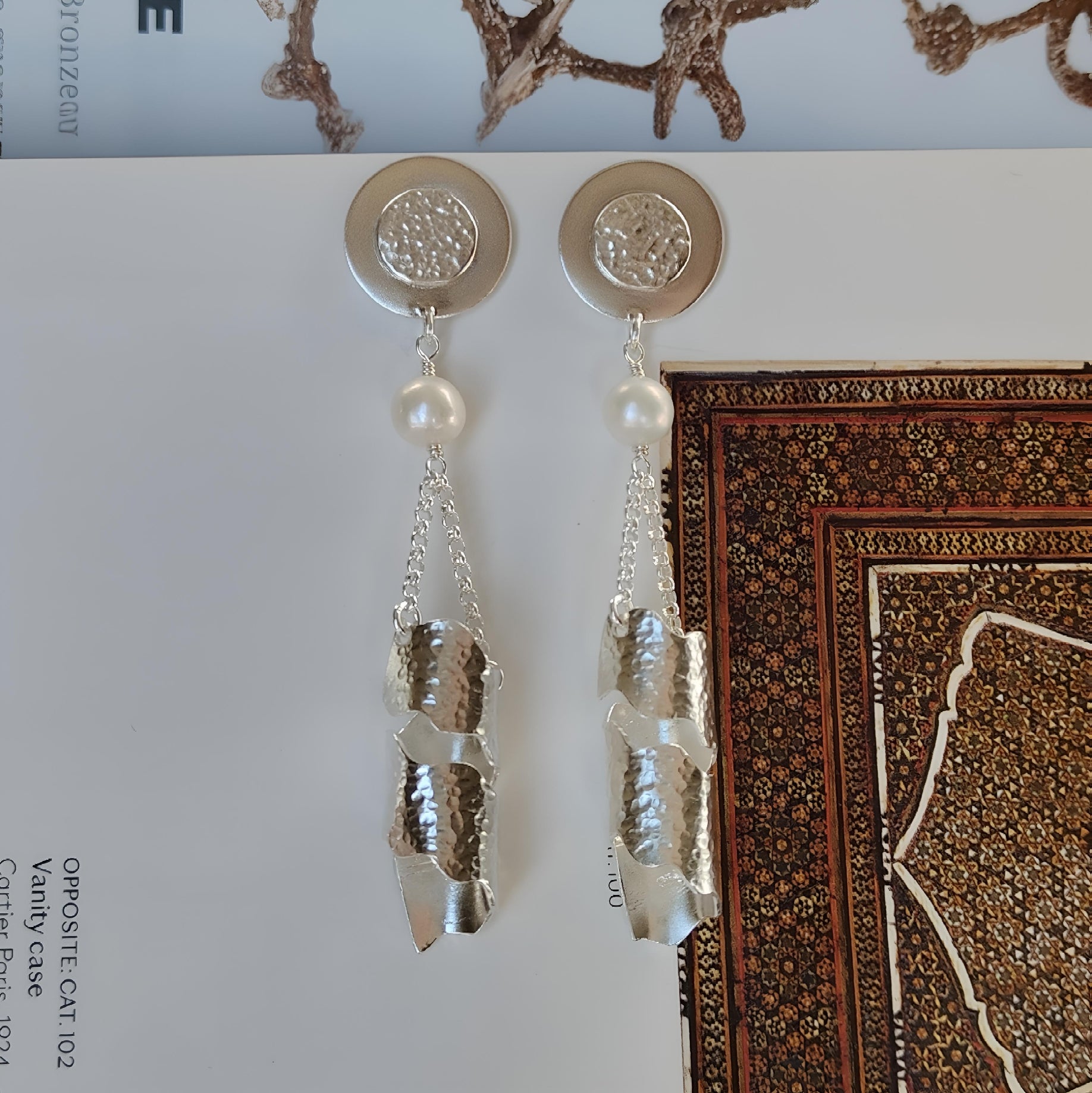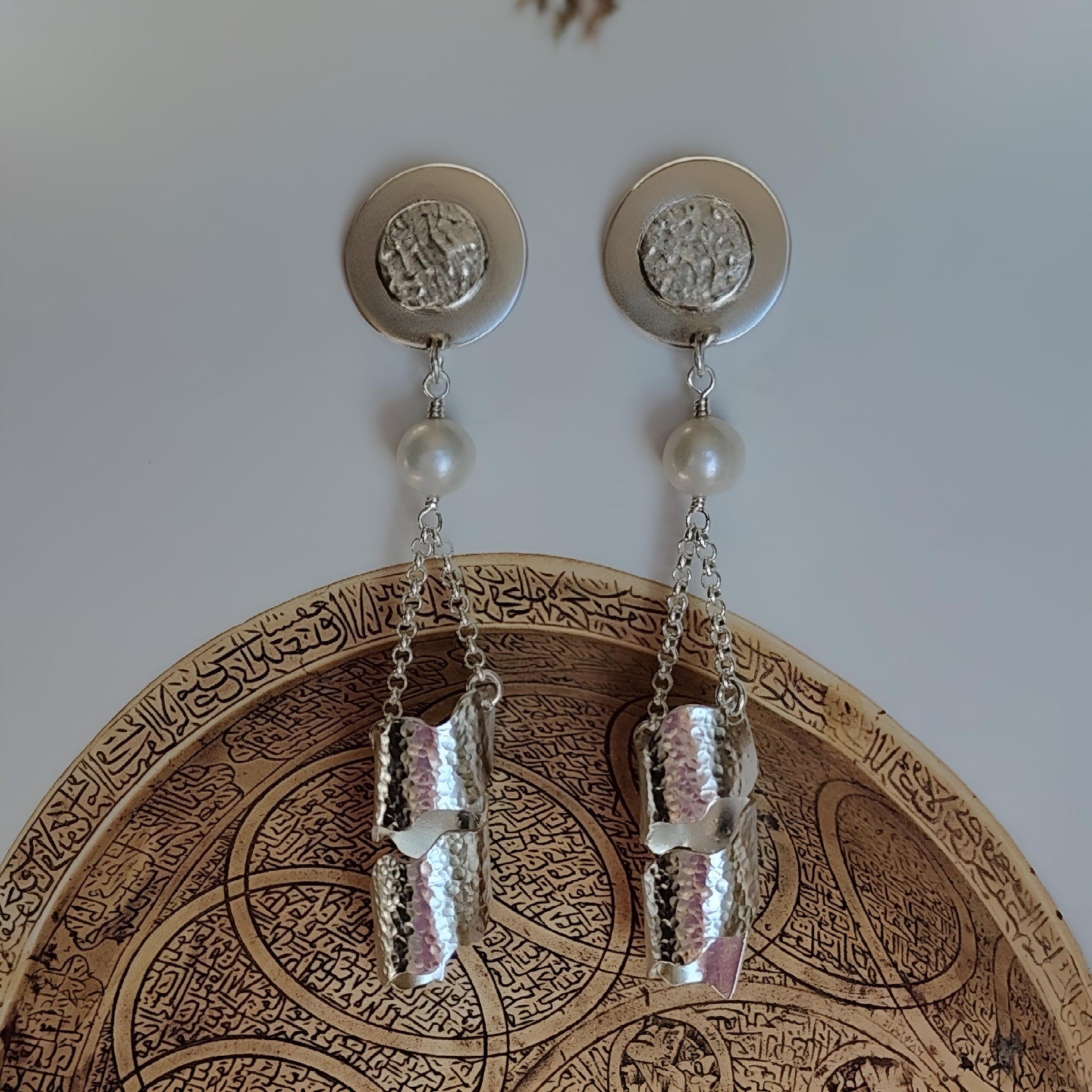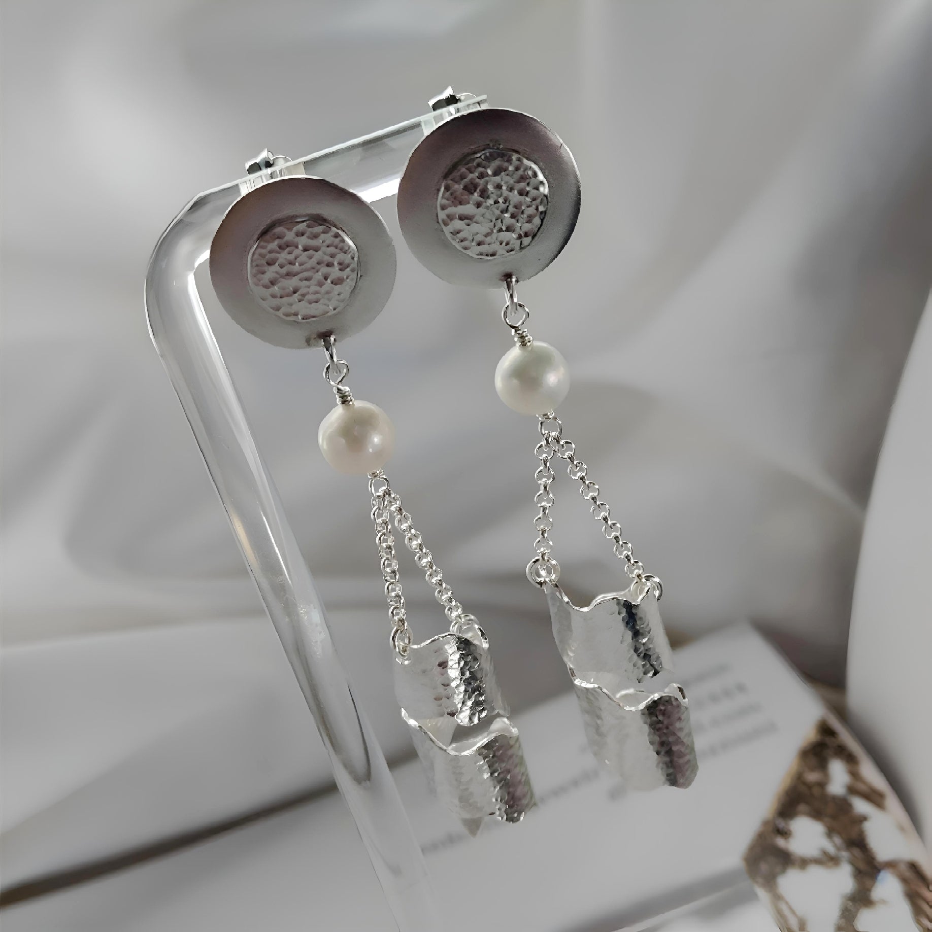 Orecchini in argento martellato 925 con perle d'acqua dolce.