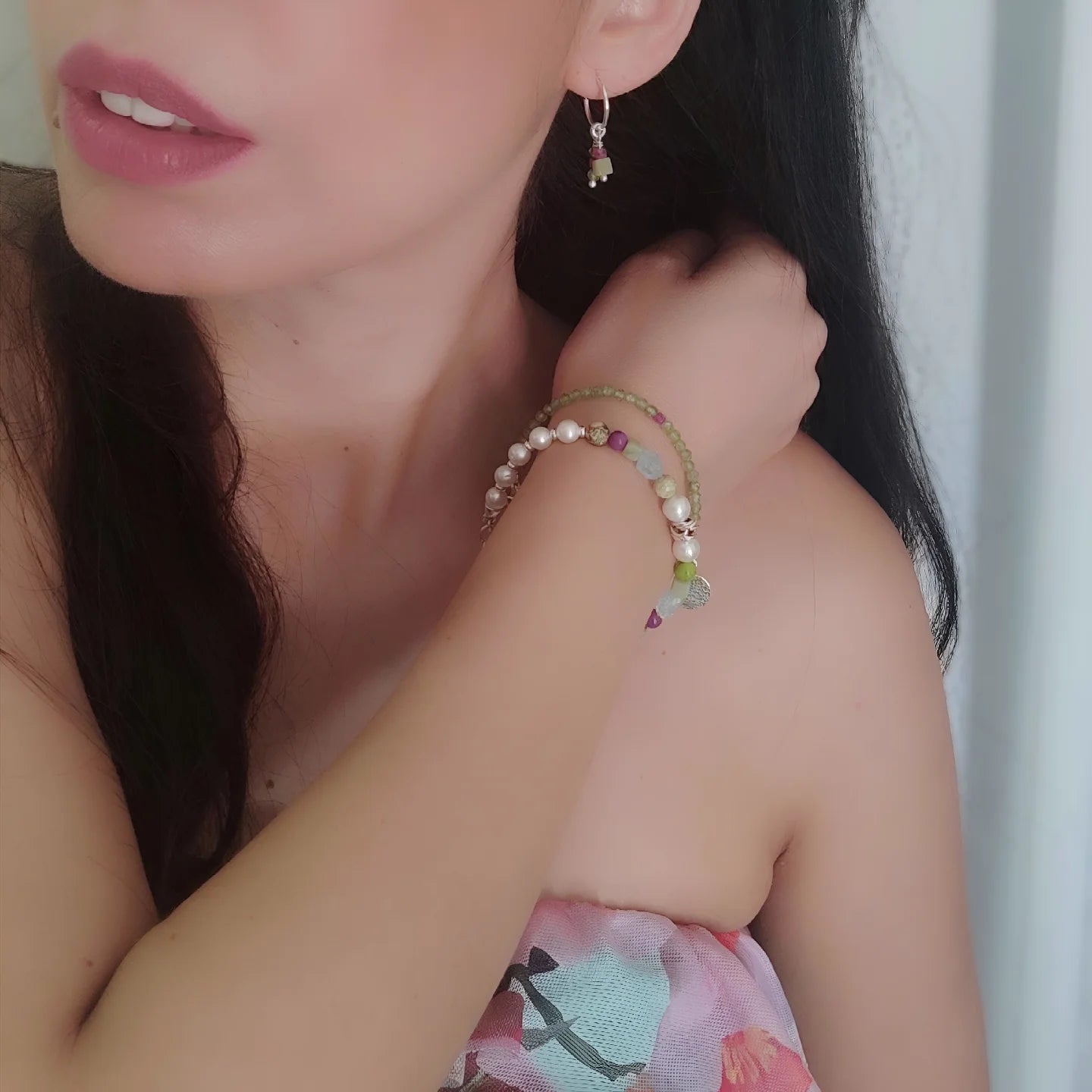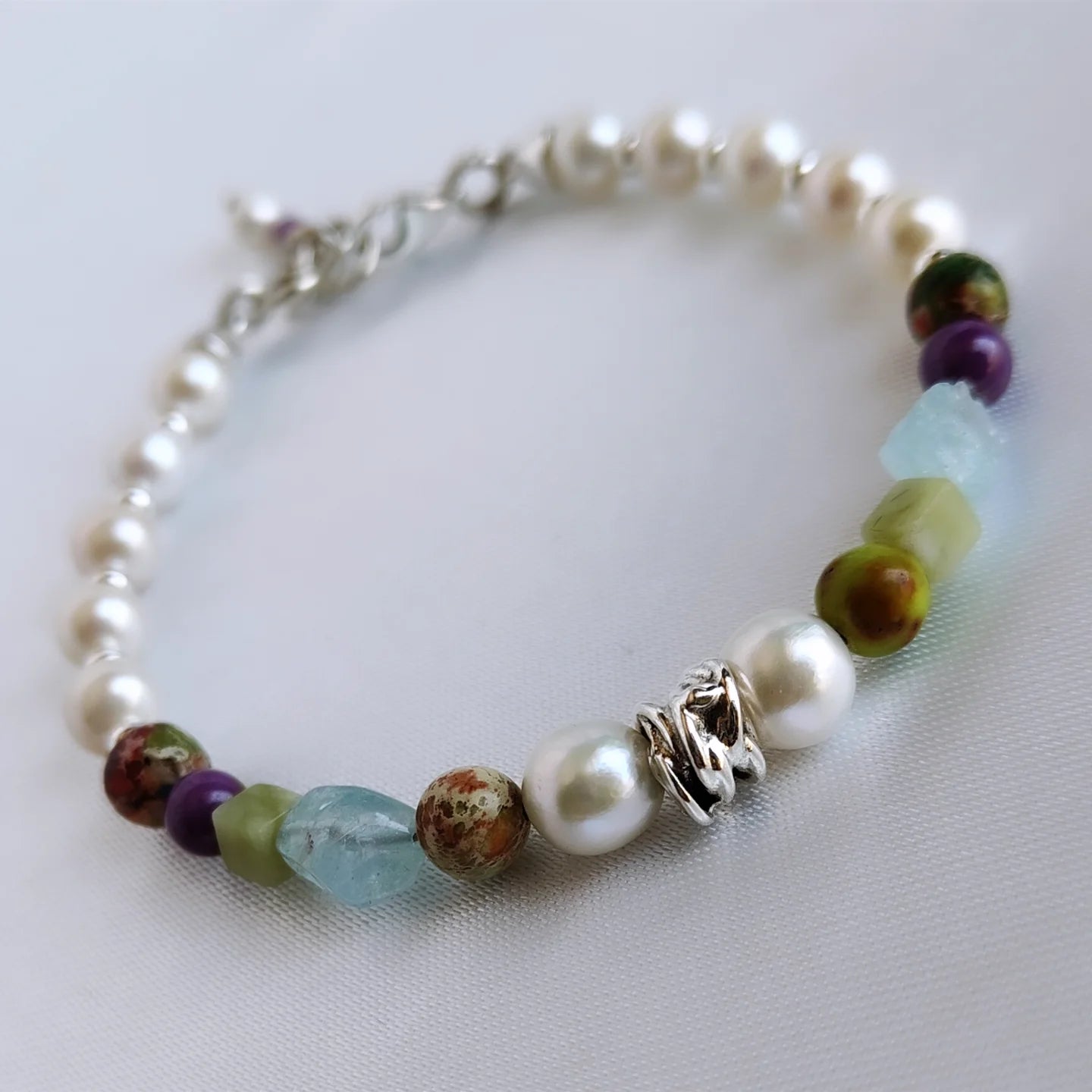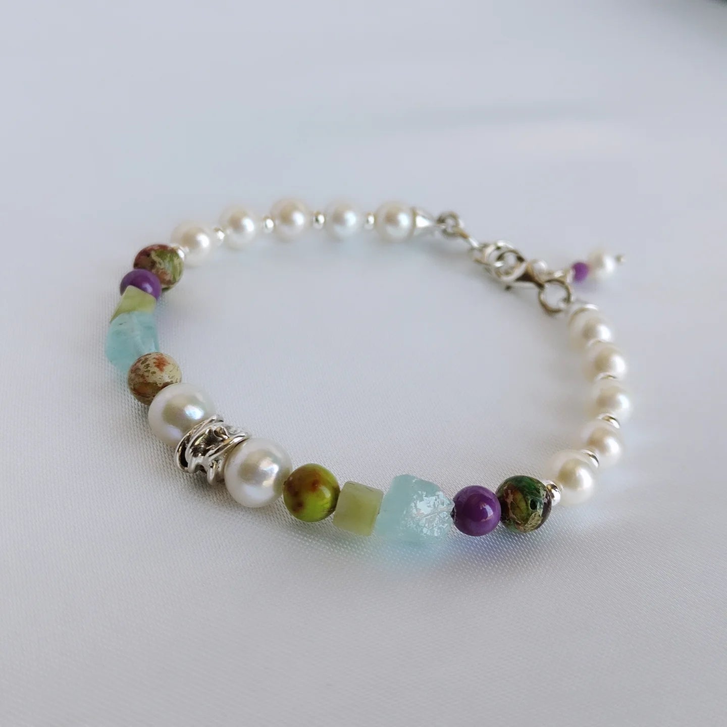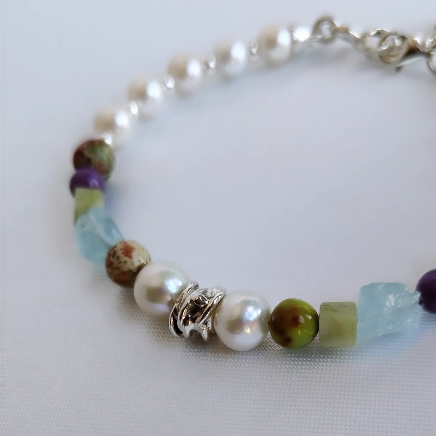 Composto da un'armonia di acquamarina grezza, giada coreana, lepidolite viola, diaspro verde e perle d’acqua dolce, è rifinito con componenti in argento 925 di alta qualità.
