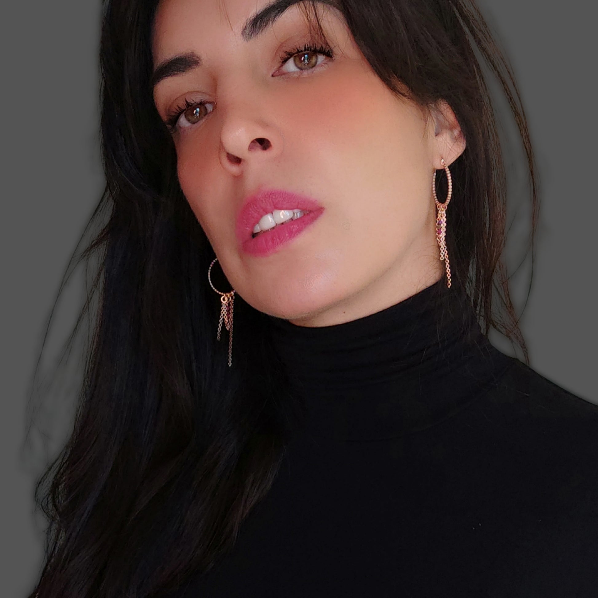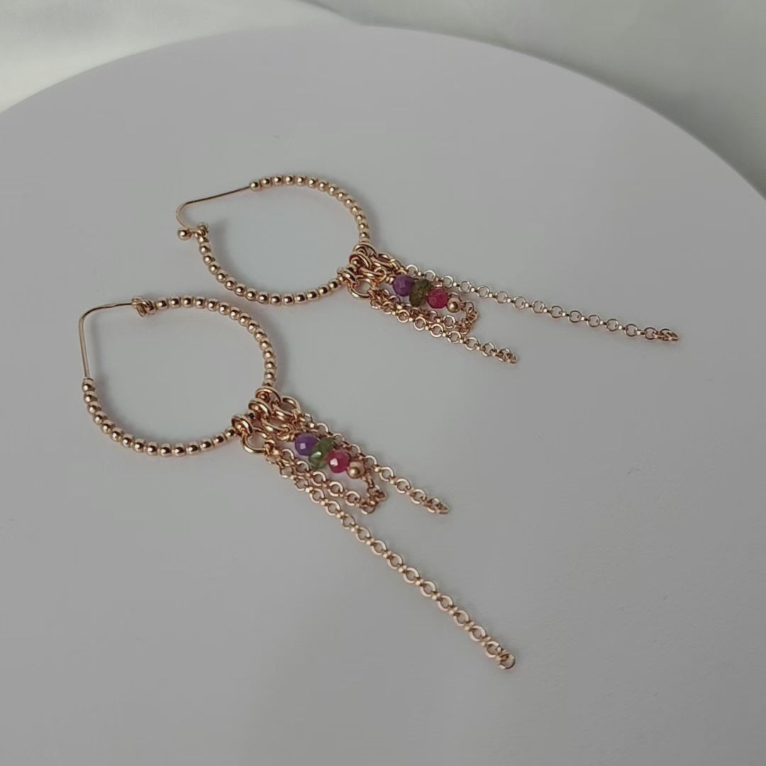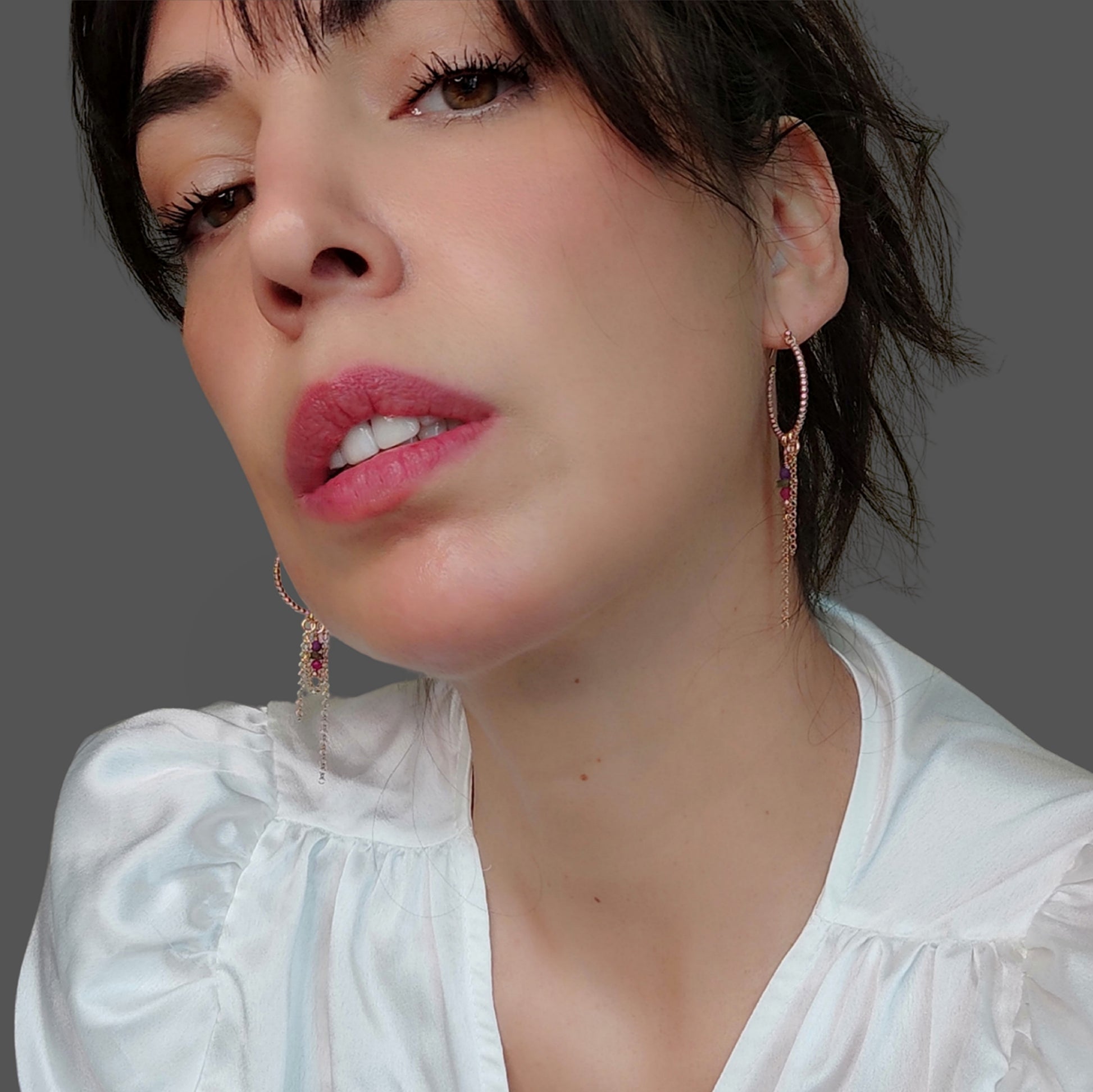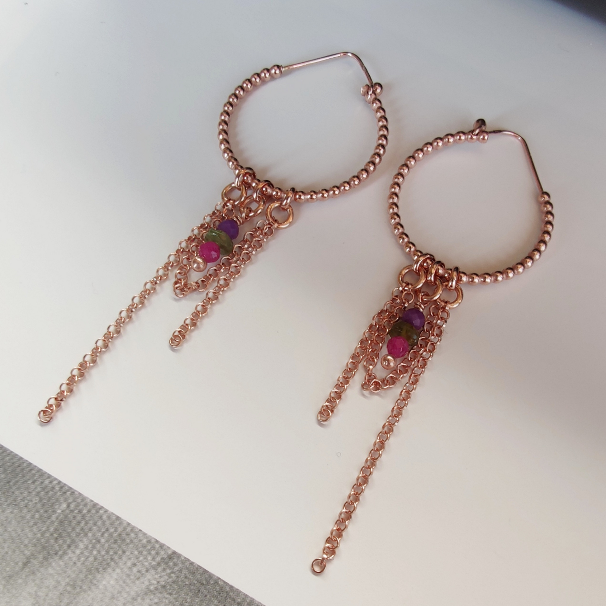 Orecchini in argento 925 placcato oro rosa 18k con pietre naturali in: lepidolite sfaccettata tonda, tormalina e rubini sfaccettati tondi.