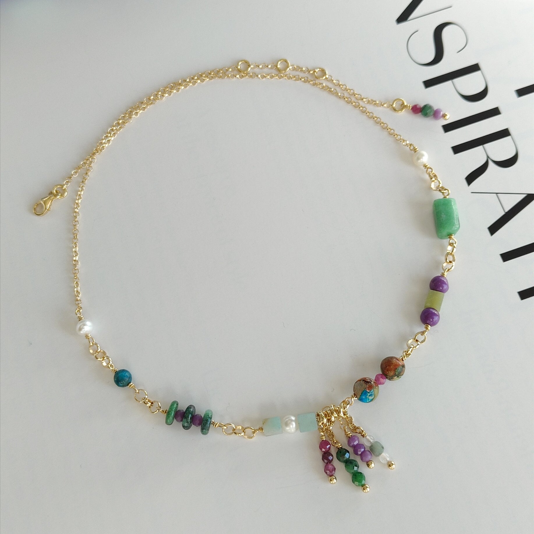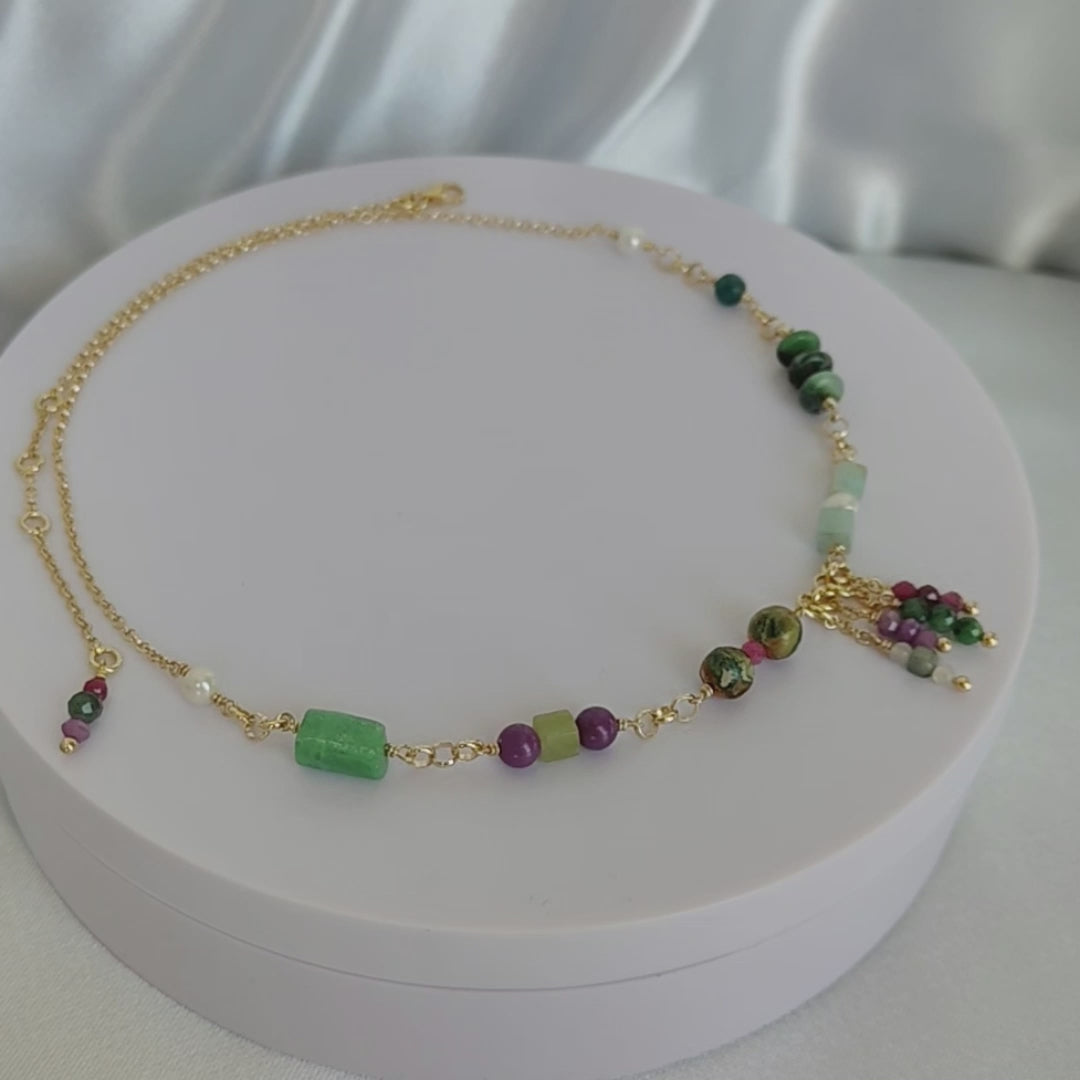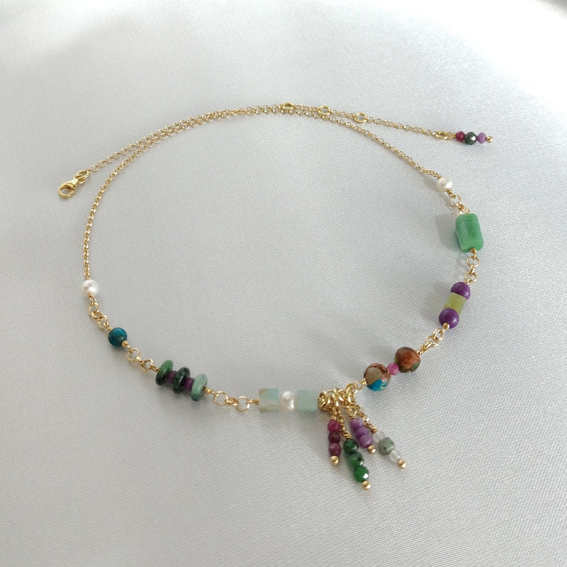 Collana girocollo in argento 925 placcato oro giallo 18k con pietre naturali in: Giada coreana cubica liscia, Fosfosiderite tondo liscio, Diaspro, Rubini zoisite, Amazzonite cubica liscia, Apatite, Rubini sfaccettati tondi, Smeraldi sfaccettati tondi, Lepidolite tonda sfaccettata e perle d'acqua dolce.