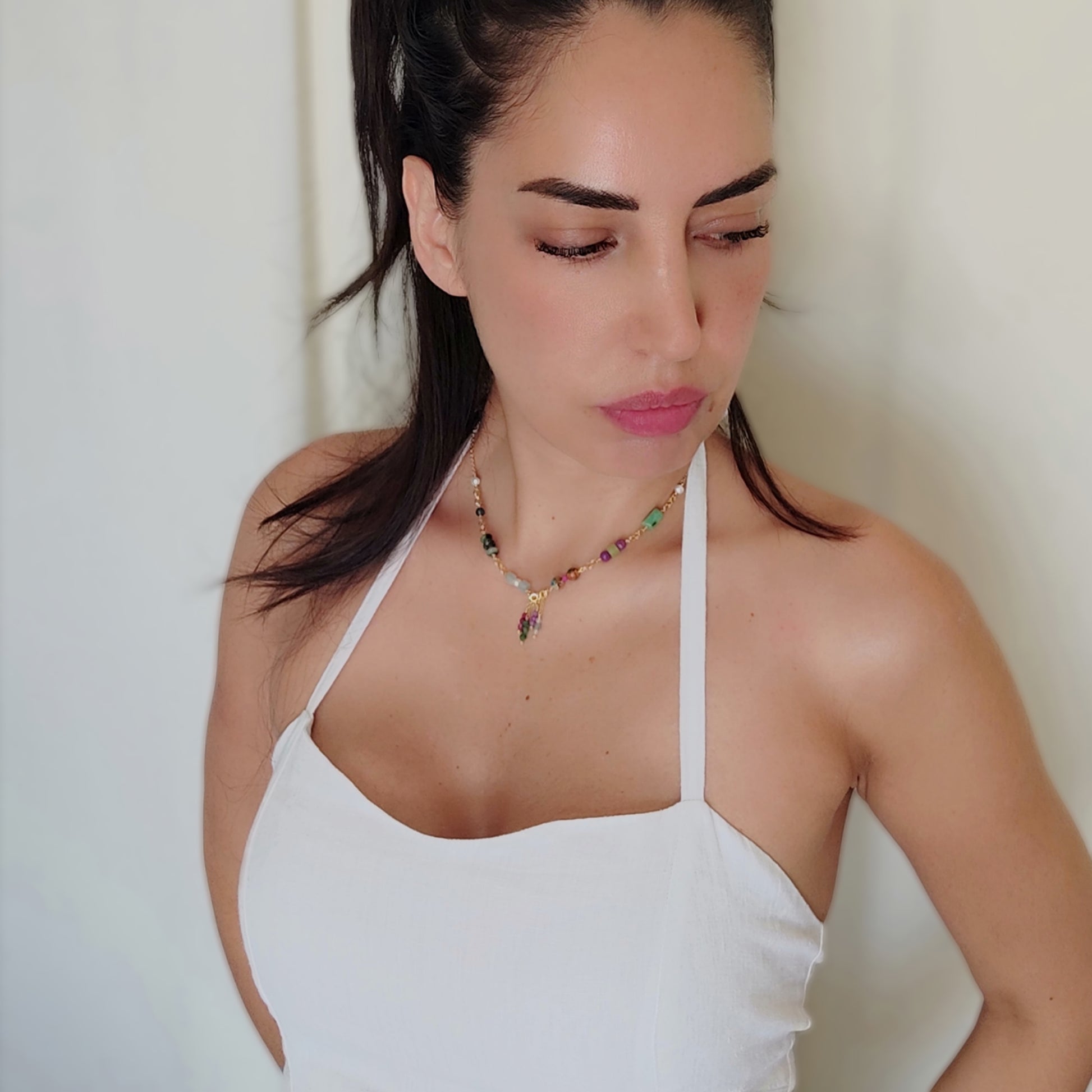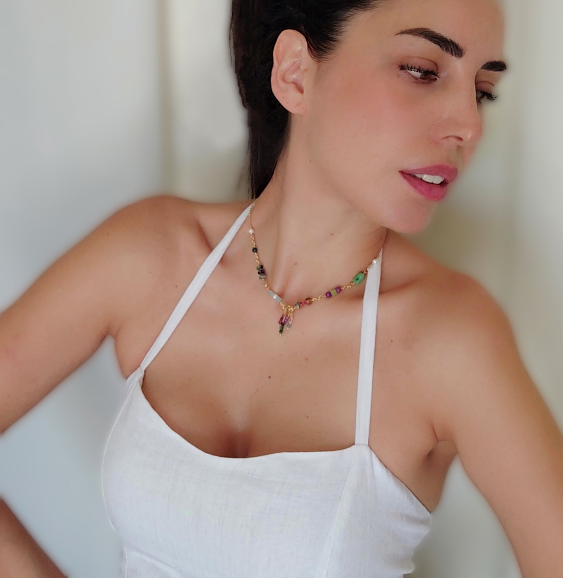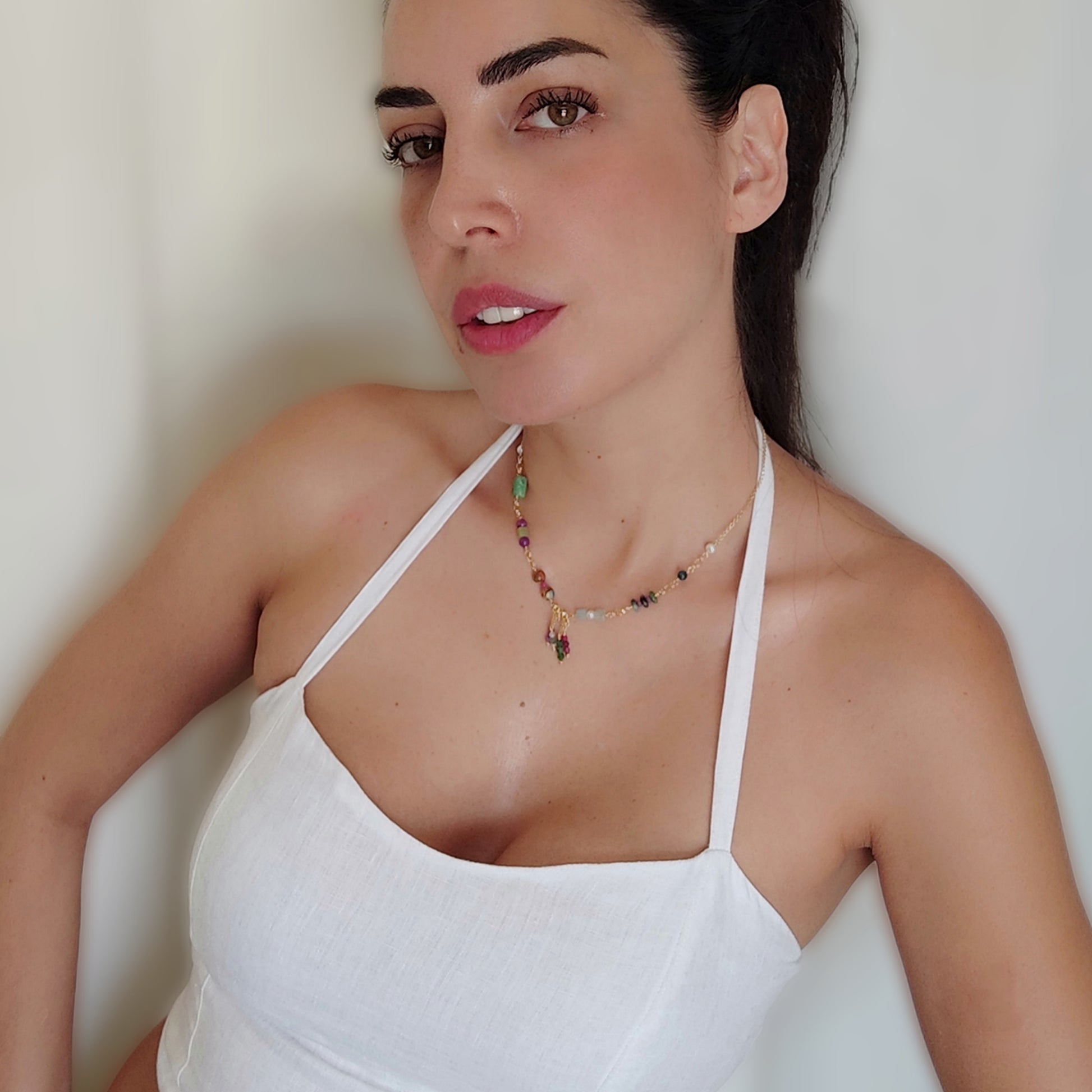Collana girocollo in argento 925 placcato oro giallo 18k con pietre naturali in: Giada coreana cubica liscia, Fosfosiderite tondo liscio, Diaspro, Rubini zoisite, Amazzonite cubica liscia, Apatite, Rubini sfaccettati tondi, Smeraldi sfaccettati tondi, Lepidolite tonda sfaccettata e perle d'acqua dolce.